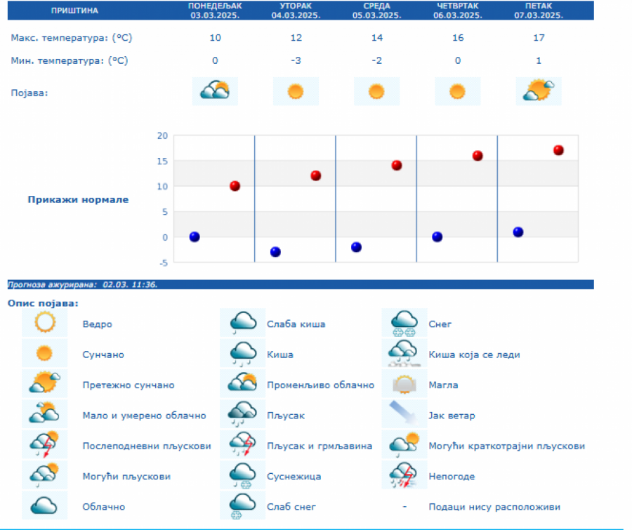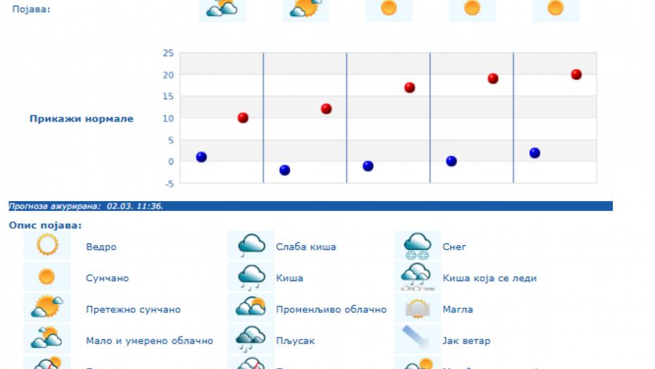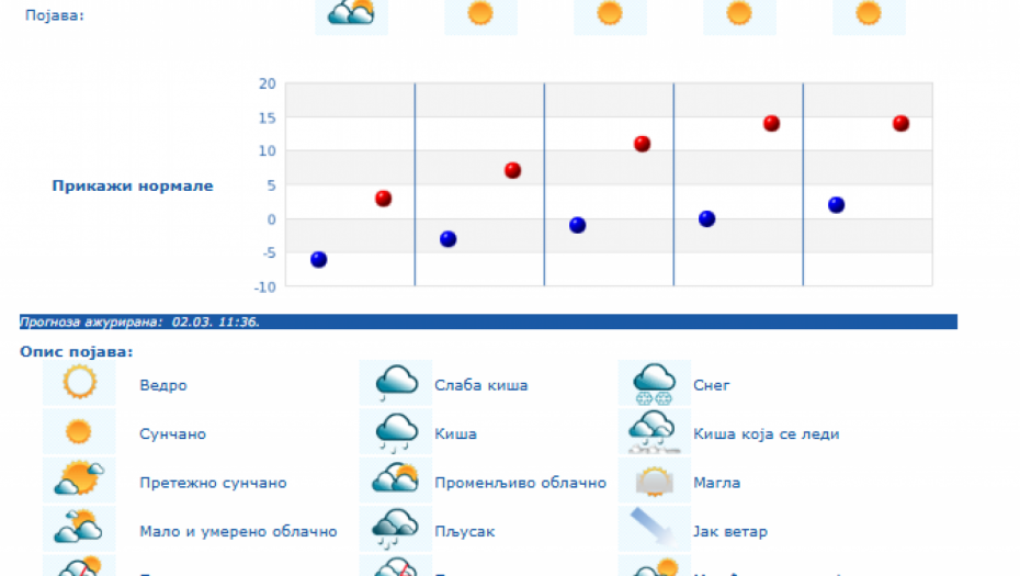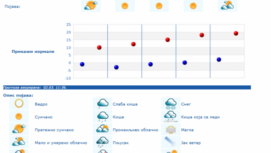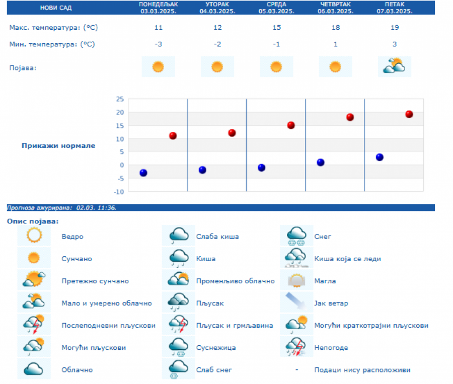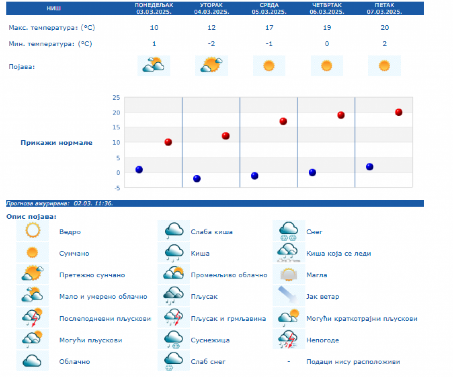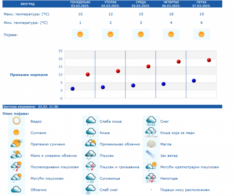 Što se tiče izgleda vremena u Srbiji za narednih sedam dana - do 10. marta, sledeće sedmice se očekuje pretežno sunčano i postepeno toplije vreme. Za vikend, 8. i 9. marta, prognozira se umereno naoblačenje, ali će se zadržati suvo vreme.