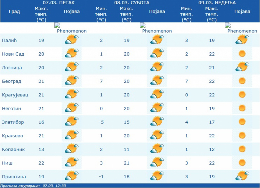 Temperature od minus dva do 22 stepena, saopštio je RHMZ.