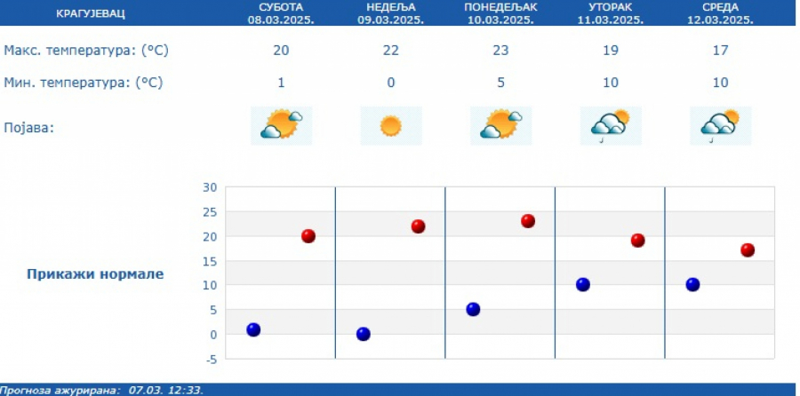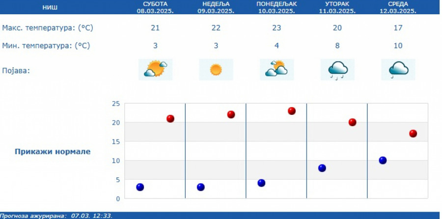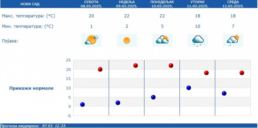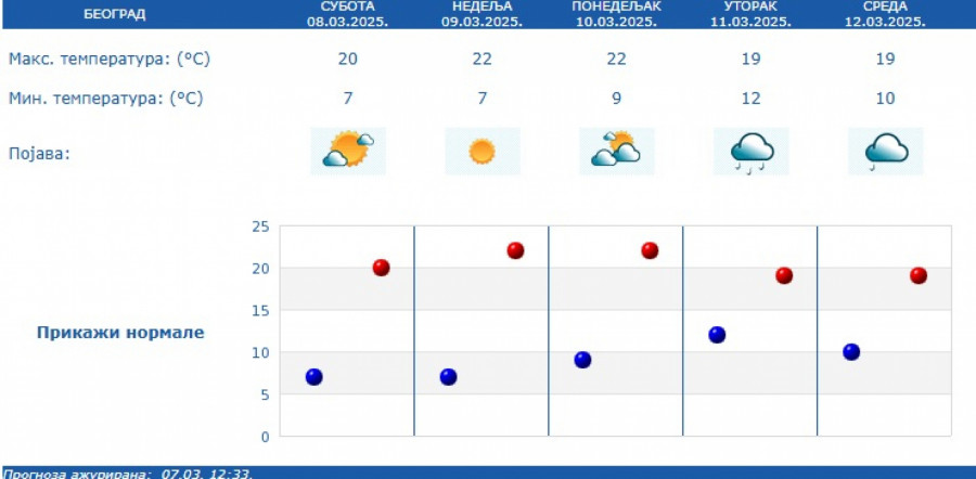 U narednih nedelju dana zadržaće se temperature od 17 do 22 stepena, s tim što će od utorka biti promenljivo, mestimično sa kišom i lokalnim pljuskovima.
