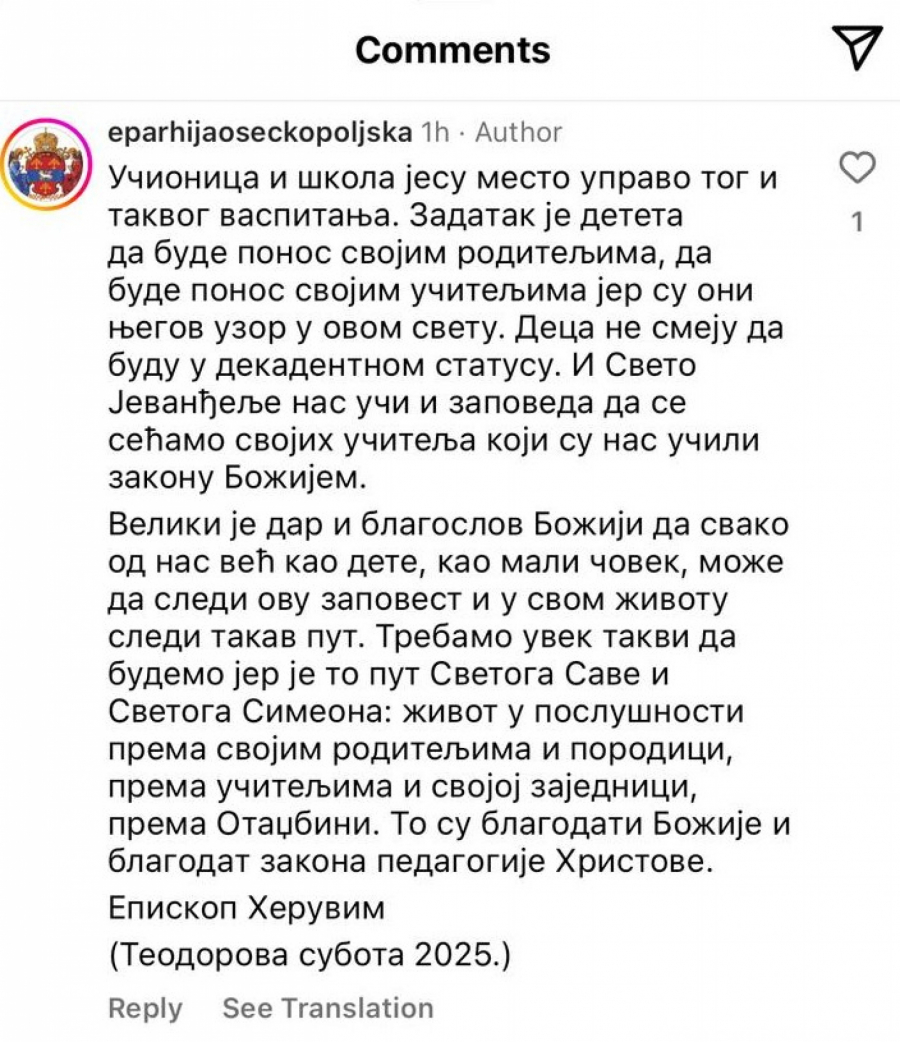 "Učionica i škola jesu mesto upravo tog i takvog vaspitanja. Zadatak je deteta da bude ponos svojim roditeljima, da bude ponos svojim učiteljima jer su oni njegov uzor u ovom svetu. Deca ne smeju da budu u dekadentnom statusu. I Sveto Jevanđelje nas uči i zapoveda da se sećamo svojih učitelja koji su nas učili zakonu Božijem", piše na objavi na Instagramu.