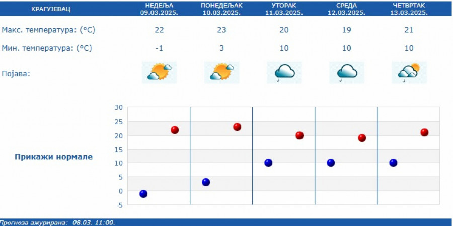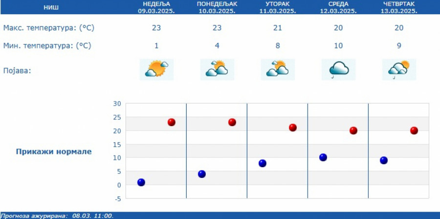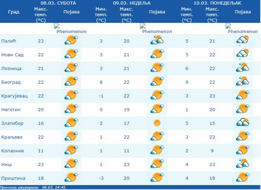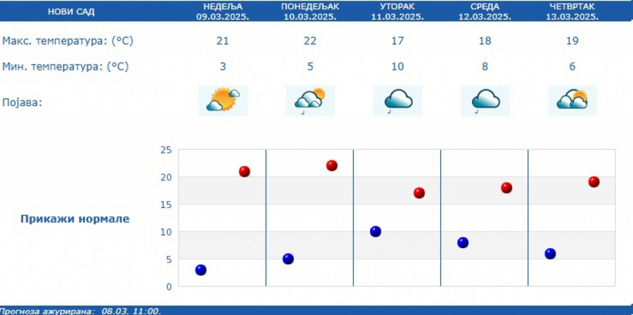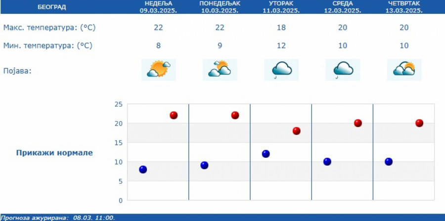 Na pojedinim lokalitetima, kiša će kratkotrajno biti intenzivnija (20 do 30 mm) uz prolazni pad temperature, ali se u većini mesta sve do 16. marta i dalje očekuje toplo vreme za ovaj period godine (od 17 do 23 stepeni).