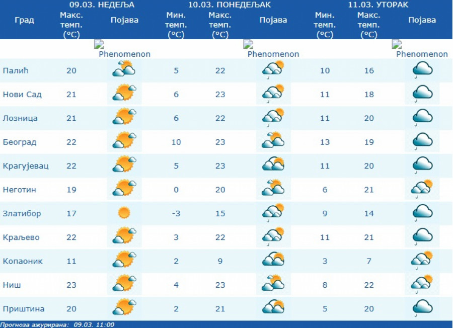 Duvaće vetar slab i umeren, u planinskim predelima i košavskom području i jak, južnih smerova, dok će se najniža temperatura kretati od -1 na istoku i jugoistoku Srbije do 10 stepeni u Beogradu, a najviša temperatura biće od 20 do 24 stepena.