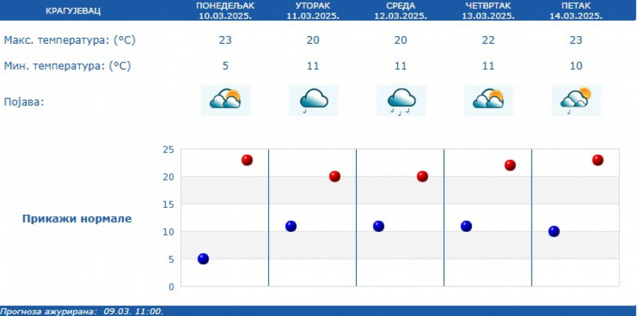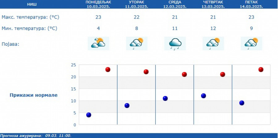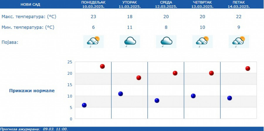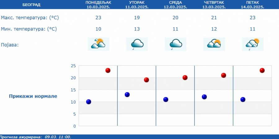 Prema izgledima vremena u Srbiji za narednih sedam dana, do 17. marta, zadržaće se uglavnom toplo, ali promenljivo vreme uz smenu sunčanih i oblačnih perioda.