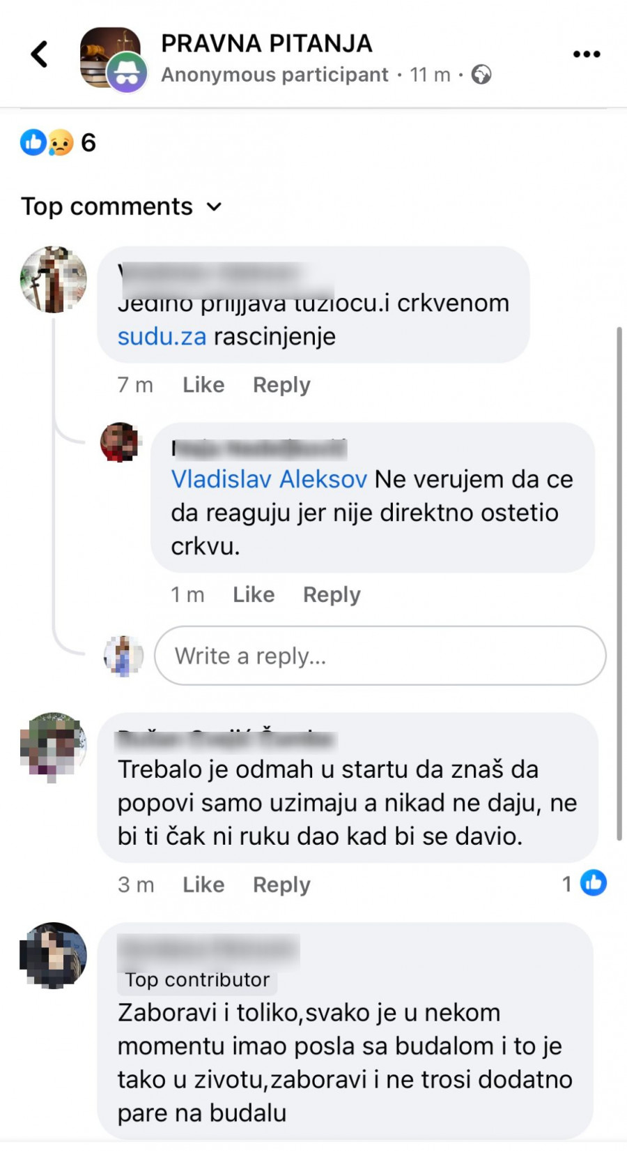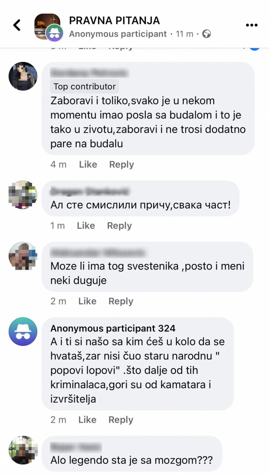 "Pozajmio sam novac svešteniku bez kamate i bilo čega, uz priznanicu i sve kako treba. Da ne dužim, nije želeo da vrati, predato na sud i spor je dobijen. U izvršnom postupku, ustanovljeno je da nema ništa na sebe od imovine, a oni nemaju platu nego od ljudi dobijaju novac na ruke. On i dalje neometano obavlja svoju službu u crkvi, a dug ne vraća. U izvršnom postupku ustanovljeno je da nisam jedini, odnosno da ga još neki izvršitelji jure. Obratio sam se i crkvi, oni smatraju da je to privatna stvar što on vara narod" – anonimno se požalio jedan od članova Fejsbuk grupe Pravna pitanja, a potom su usledili brojni komentari.