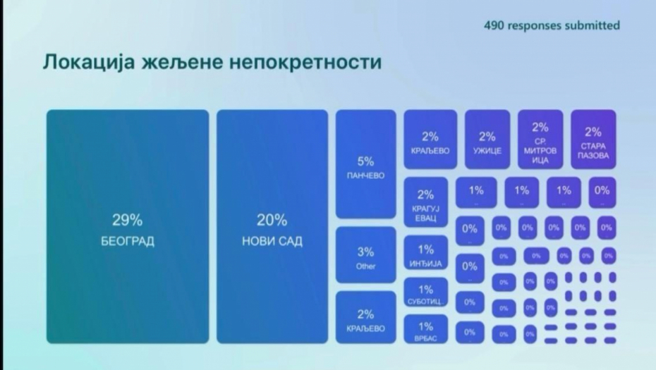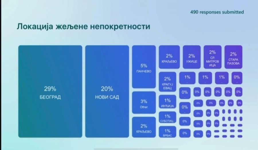 Čak 29% podnosilaca bi kao lokaciju željene nekretnine upisalo Beograd, kao što je i očekivano. Na drugom mestu liste želja je Novi Sad, sa 20% od ukupnog broja zahteva. Nakon toga sledi Pančevo sa 5%, najviše zbog blizine srpske prestonice, a sa po 2% se izdvajaju i Kraljevo, Užice, Sremska Mitrovica, Stara Pazova i Kragujevac.
