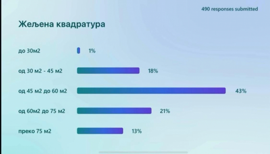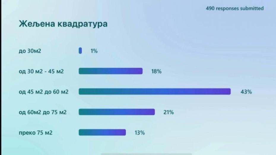 Najviše mladih bi da se useli u nekretninu od 45 do 60 metara kvadratnih, 43% njih. Manje je onih koji žele stan veličine od 60 do 75 kvadrata, njih 21%, a 18% zahteva je za prostor koji je ne manji od 30, a ne veći od 45 kvadratnih metara.