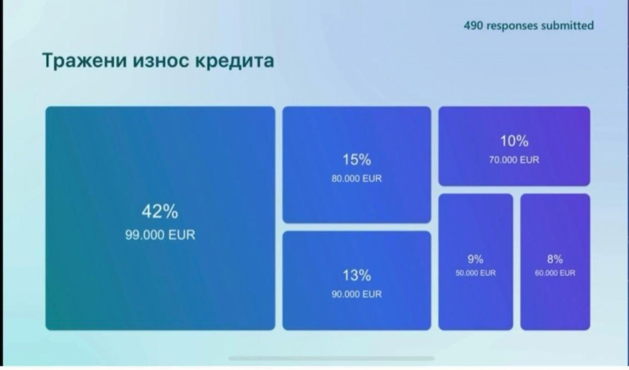Traženi iznos kredita je u 42% slučajeva 99.000 evra, oko 15% mladih želi kredit od 80.000 evra, a njih 13 procenata od 90.000 evra.