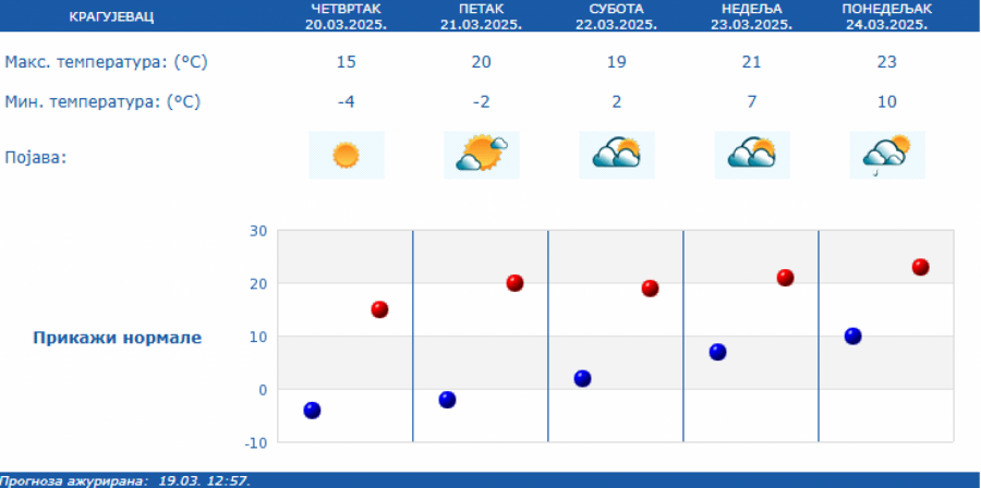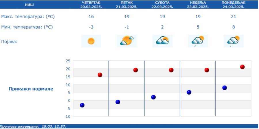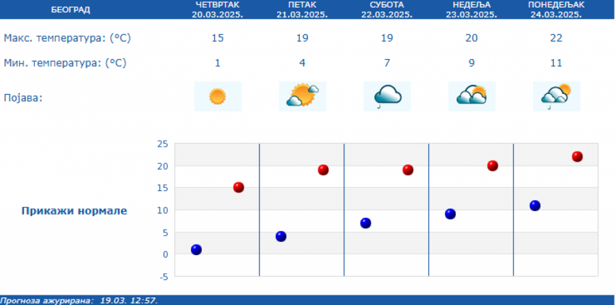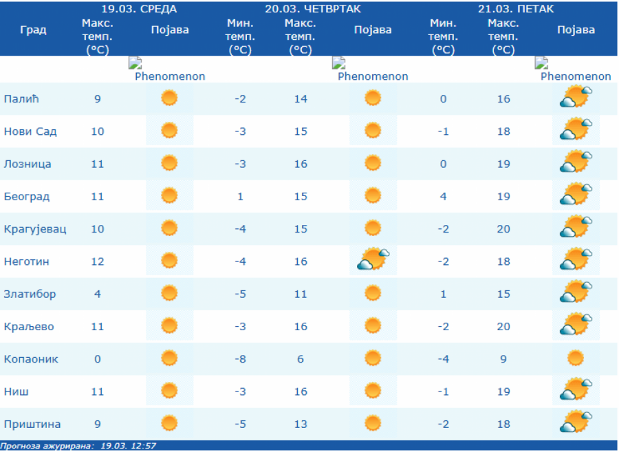 U Srbiji će u četvrtak, 20. marta jutro biti hladno, ponegde sa umerenim mrazem, a tokom dana sunčano uz slab promenljiv vetar, saopštio je RHMZ.