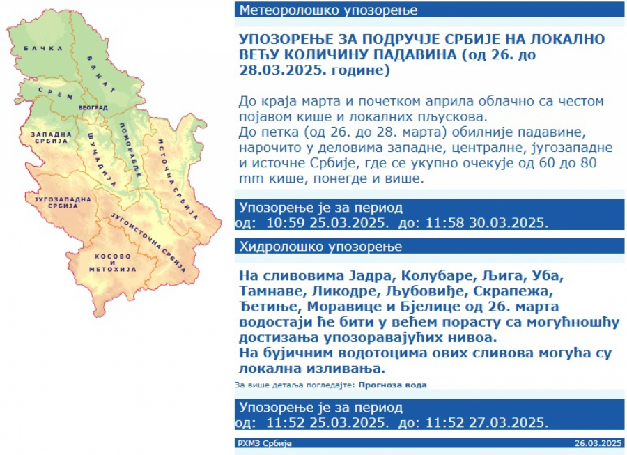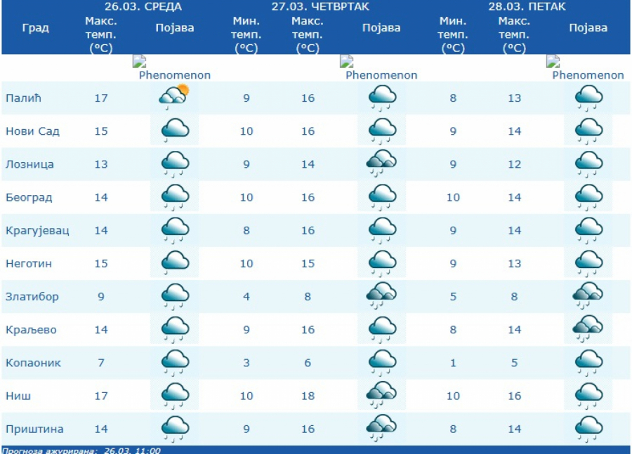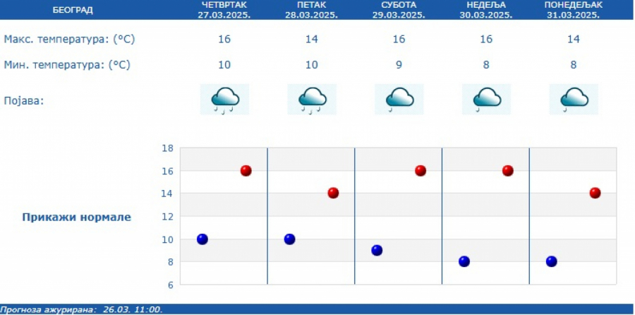 I u narednih sedam dana, do 3. aprila, zadržaće se oblačno sa čestom kišom i lokalnim pljuskovima. U petak se očekuju obilnije padavine, naročito na istoku Srbije.