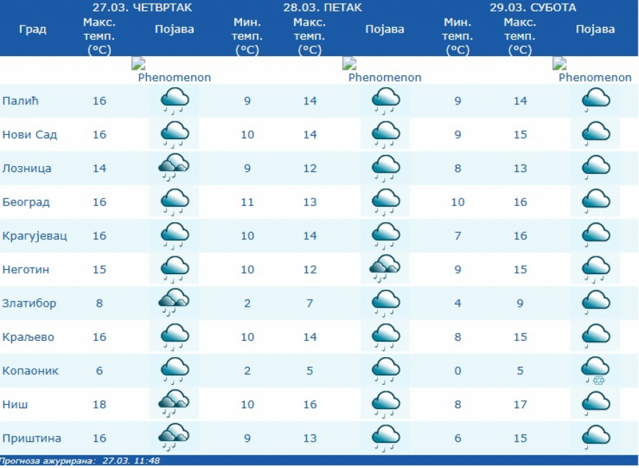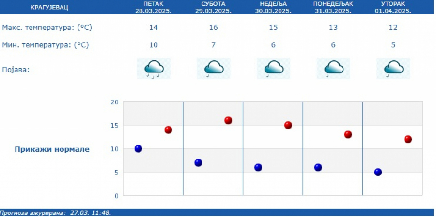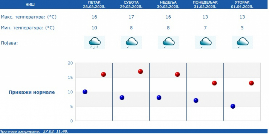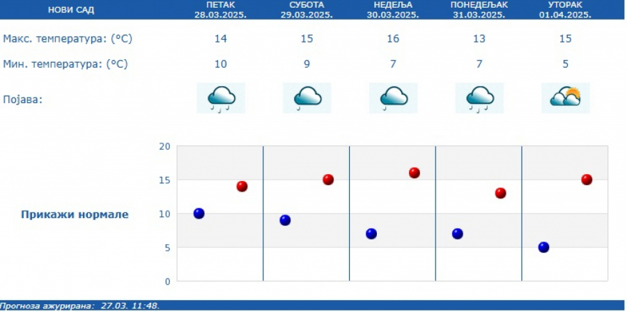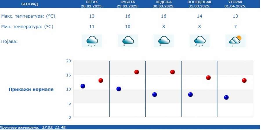 Najniža temperatura biće oko 11 stepeni, a najviša dnevna oko 13 stepeni.