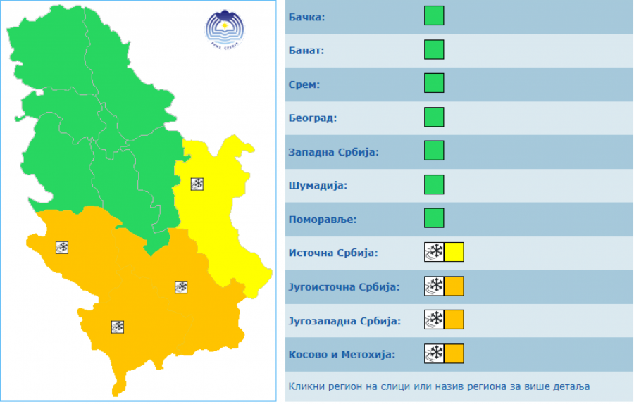 Na planinama, jugozapadu i jugu zemlje sa snegom uz formiranje manjeg snežnog pokrivača, duvaće umeren i jak vetar, severni i severozapadni, u planinskim predelima ponegde i sa udarima olujne jačine.