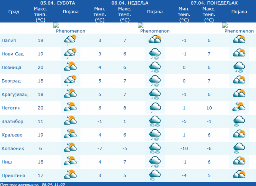 Tokom dana mestimično sa kišom ali i kratkotrajnim pljuskovima snega, a temperature će se kretati od tri do osam stepeni, saopštio je RHMZ.