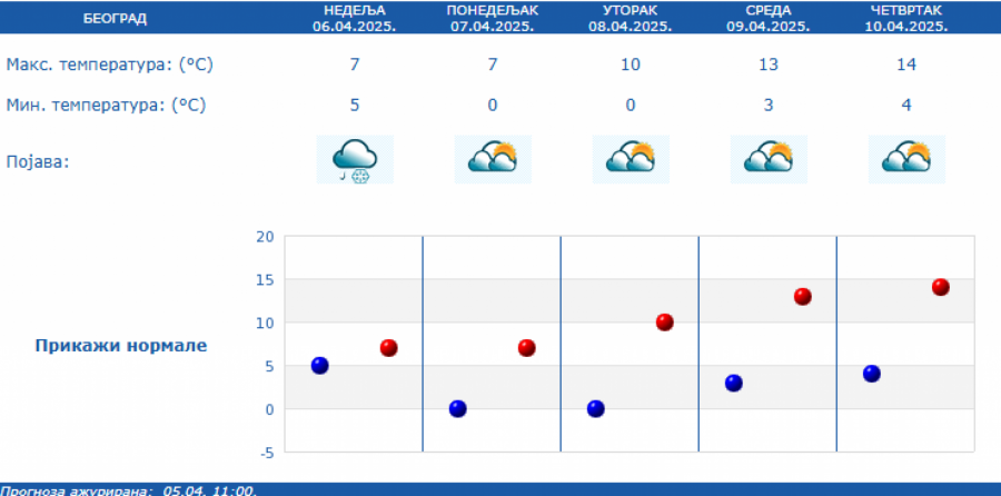 Tokom dana (od 07. do 13.04.) promenljivo oblačno vreme sa uslovima za povremene kratkotrajne padavine.