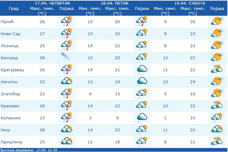 Navodi se i da se posle podne, uveče i tokom noći na području Bačke, Srema, zapadne i jugozapadne Srbije lokalno očekuju obilni pljuskovi sa grmljavinom, gradom i kratkotrajno olujnim udarima vetra.