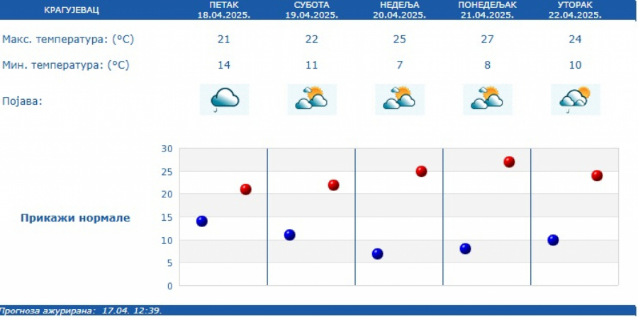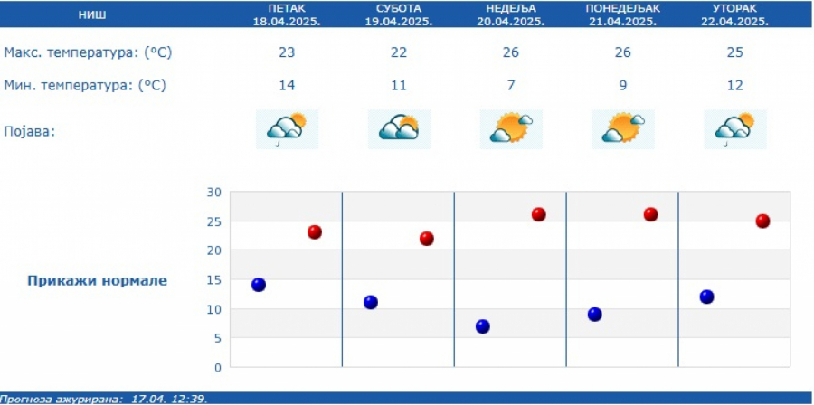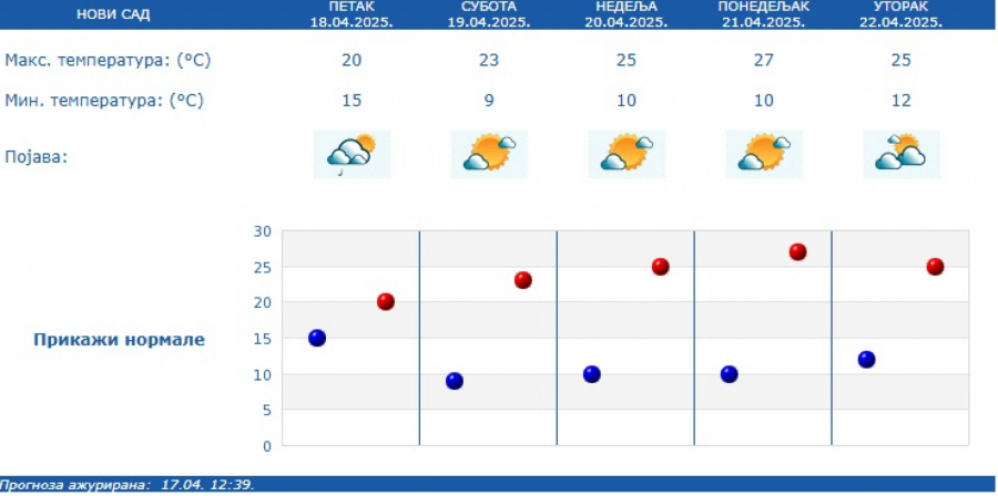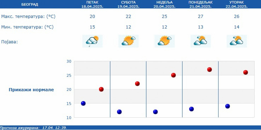 Za vikend i početkom sledeće sedmice pretežno sunčano uz malu ili umerenu oblačnost i postepeno toplije, u nedelju i ponedeljak u većini mesta ponovo od 25 do 27 °C.