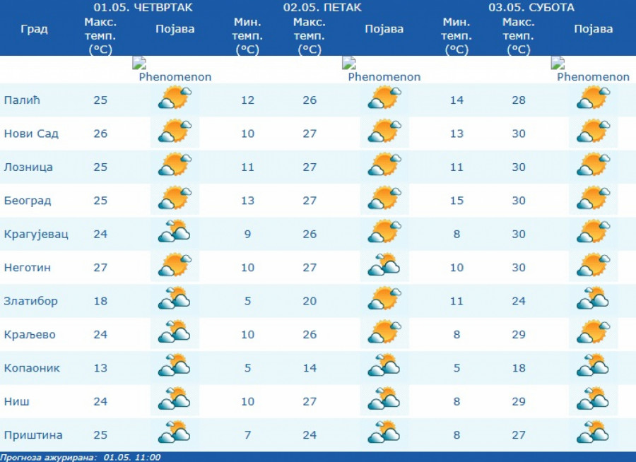 U Beogradu će vreme biti pretežno sunčano i toplo, s vetrom slabim i promenljivim i najnižom temperaturom od 11 do 13 stepeni, a najviša će biti oko 27 stepeni.