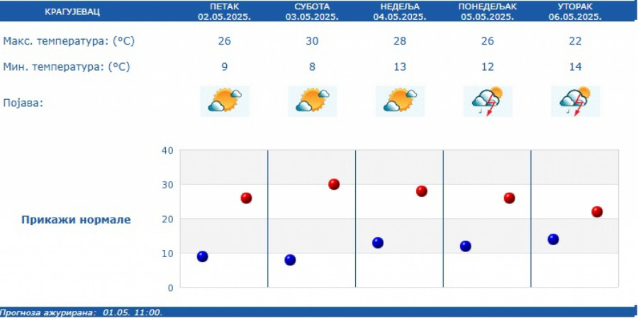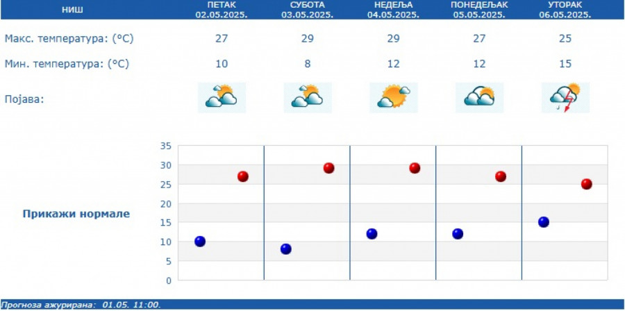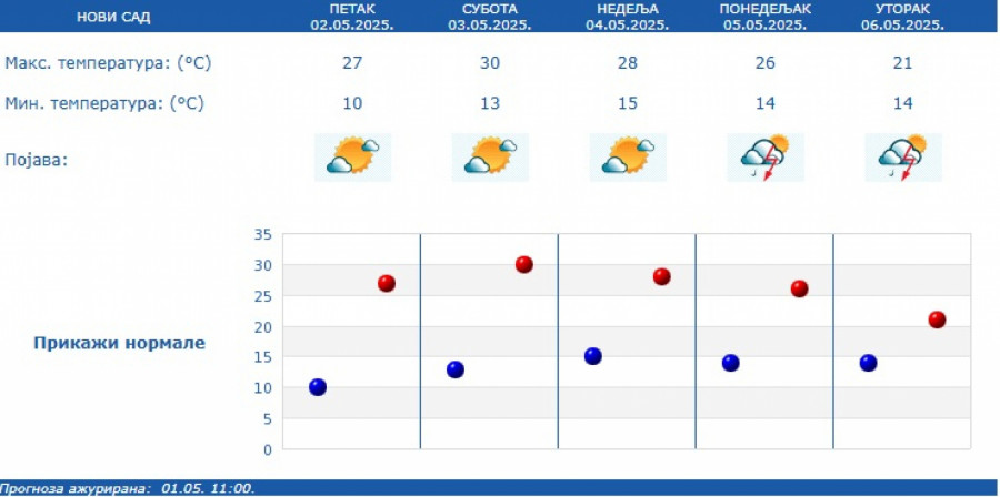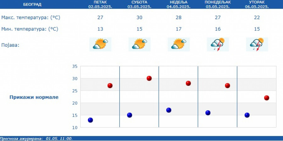 Prema izgledima vremena u Srbiji za narednih sedam dana, do 9. maja, za vikend će biti pretežno sunčano i toplo, dok će od ponedeljka biti promenljivo oblačno, malo svežije i nestabilno, povremeno sa kišom i lokalnim pljuskovima sa grmljavinom.