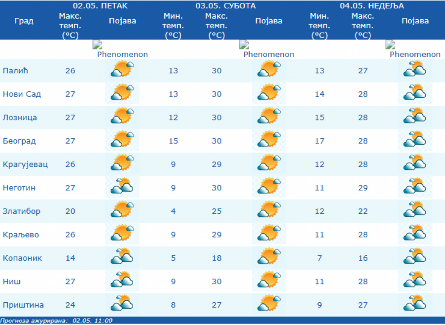 Najniža temperatura biće od 12 do 15 stepeni, a najviša oko 30.