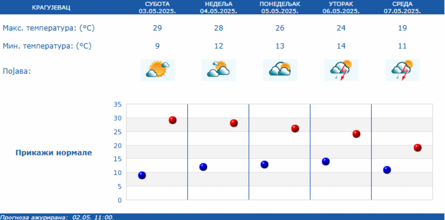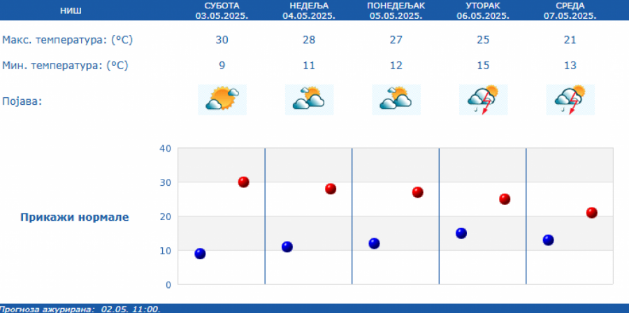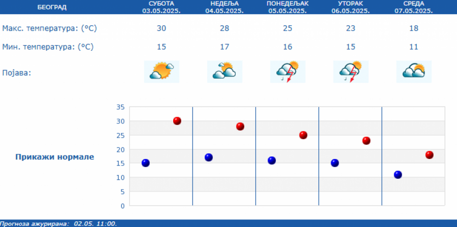 Najnestabilniji dani biće ponedeljak i utorak (5. i 6. maj) kada su lokalno moguće obilnije padavine, kratkotrajna pojava grada i jak vetar u zoni najjačih pljuskova.