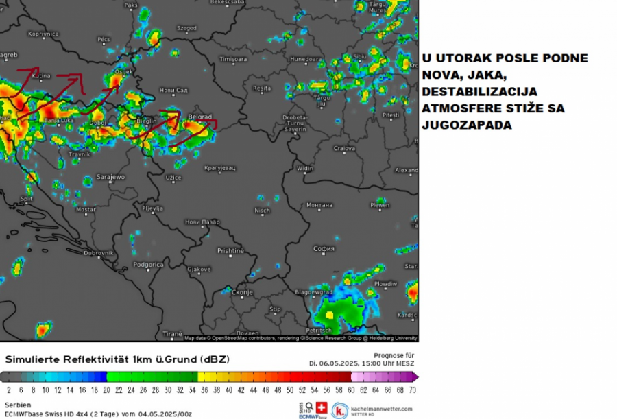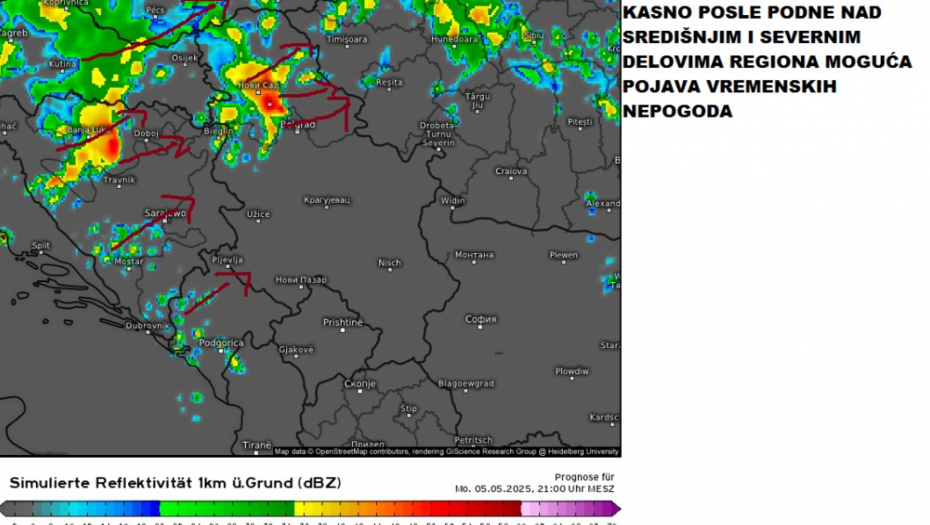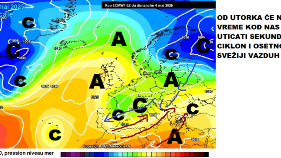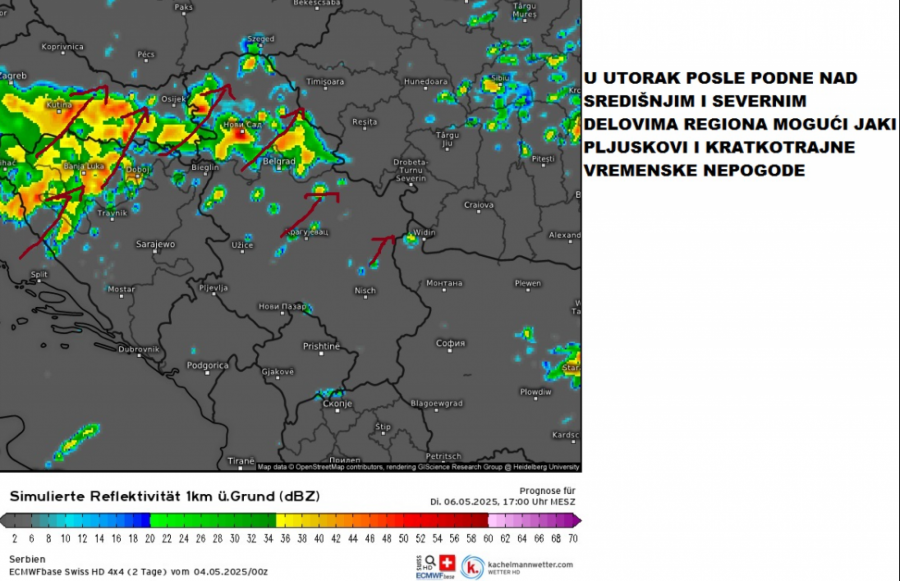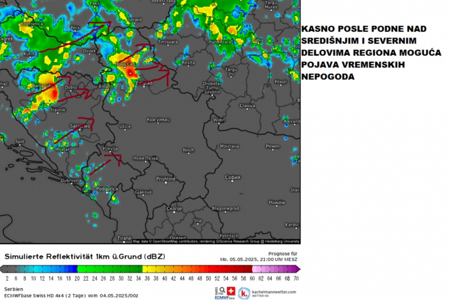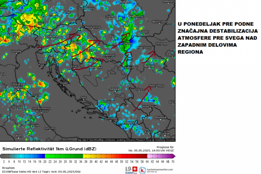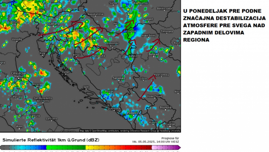 U ponedeljak će ka nama jačati uticaj sekundarnog ciklona, dok će se sa severozapada spuštati svežiji vazduh. Već pre podne nad zapadnim, severnim i središnjim delovima regiona povećanje oblačnosti ponegde uz kišu ili grmljavinski pljusak dok će posle podne i rano uveče nad središnjim i severnim delovima regiona biti uslova za lokalne vremenske nepogode uz olujan vetar, obilni kišu i pojavu tuče/grada.