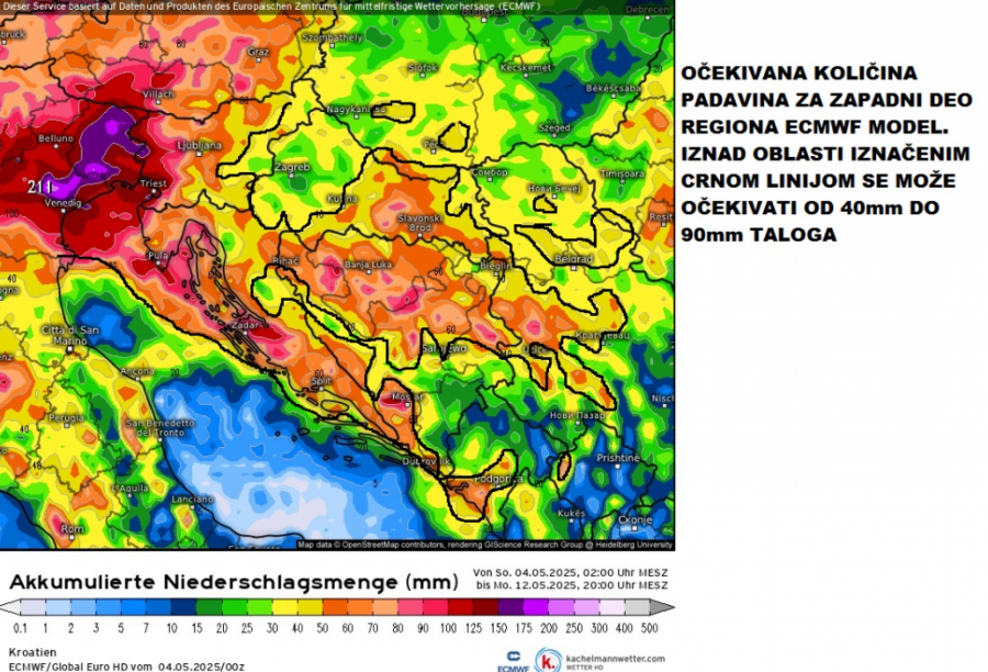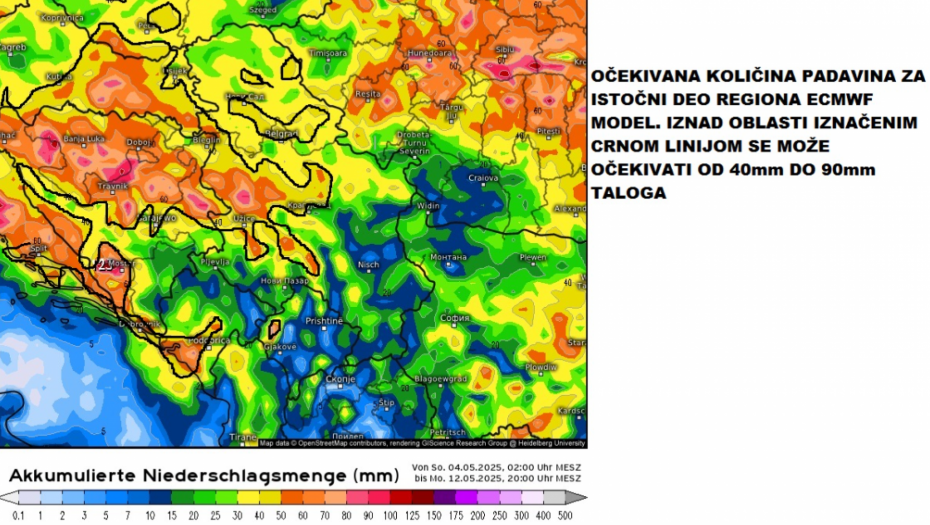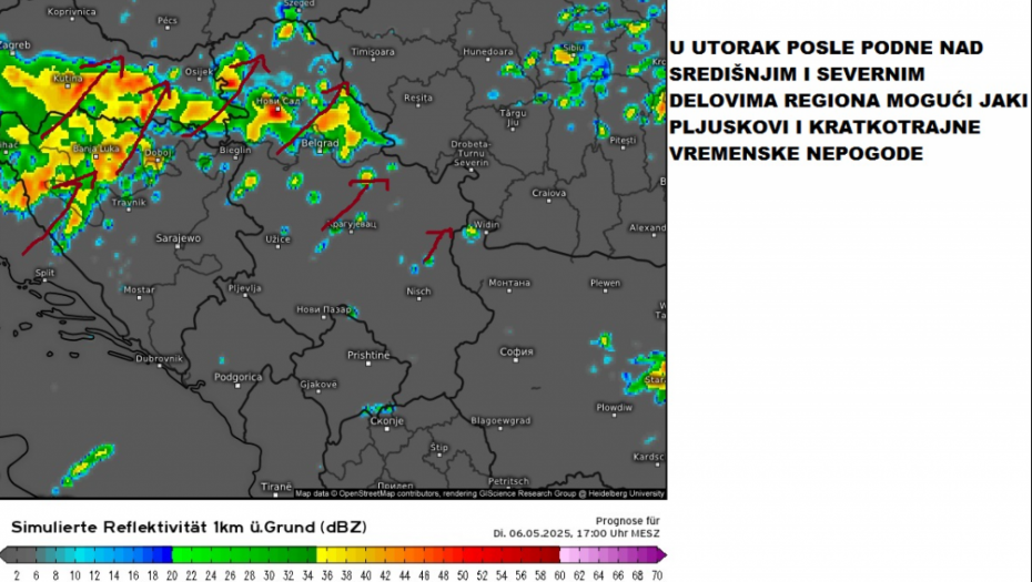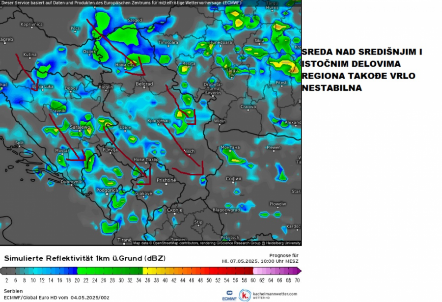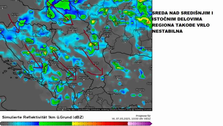 Na jugoistoku regiona manje nestabilnosti i tamo će tek u utorak posle podne biti češće pojave grmljavinskih pljuskova, kada će ponovo nad celim regionom biti vrlo nestabilno uz moguće jače pljuskove i lokalne nepogode. Ponedeljak u zoni hladnog fronta donosi prolazno olujan severozapadni vetar, dok će u utorak vetar biti slab, osim u zoni pljuskova gde će prolazno biti vrlo jak. Maksimumi u ponedeljak od oko +12 na severozapadu Hrvatske do oko +30 na istoku Srbije, a sredinom nedelje uglavnom od +14 na zapadu do +19 na istoku i jugu regiona.