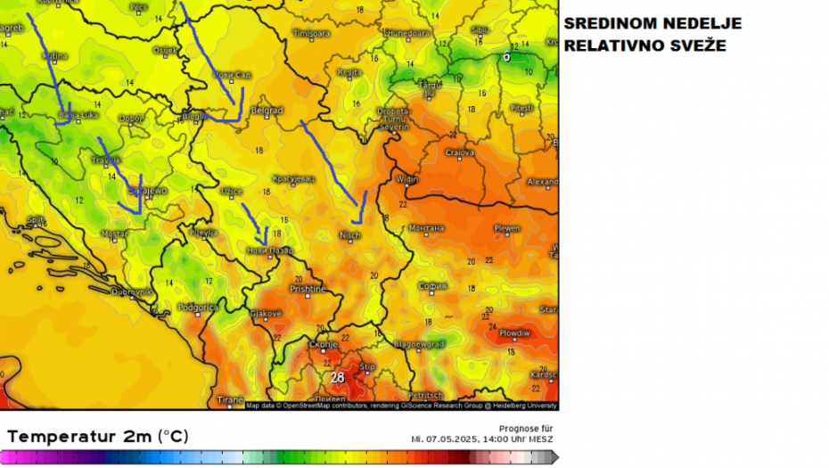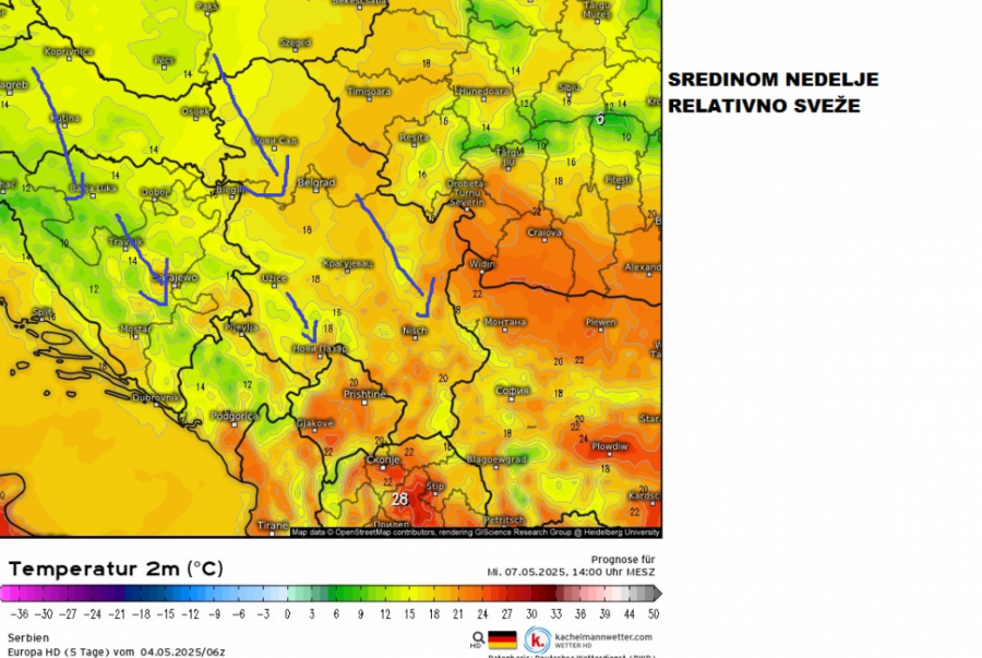 Sve do kraja sledeće nedelje najverovatnije ostaje relativno sveže i vrlo nestabilno povremeno uz kišu i grmljavinske pljuskove, duvaće severozapadni vetar, a dnevni maksimumi uglavnom od +11 do +18 stepeni Celzijusa.