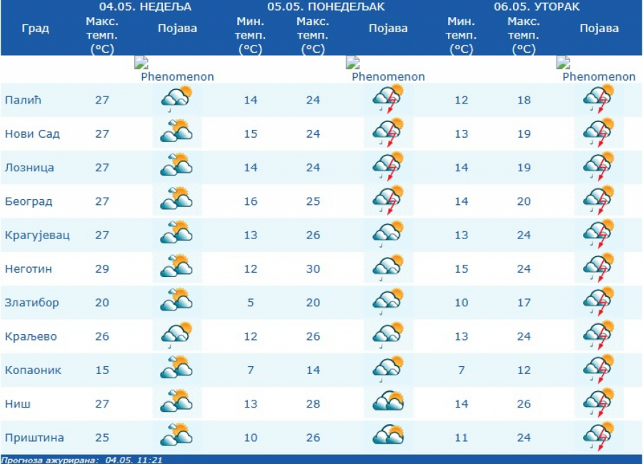 Lokalno su moguće i obilnije padavine, kratkotrajna pojava grada i jak vetar u zoni najjačih pljuskova. Vetar će biti slab i umeren, zapadnih pravaca, dok će najniža temperatura biti od 14 do 16 stepeni, a najviša oko 25 stepeni.
