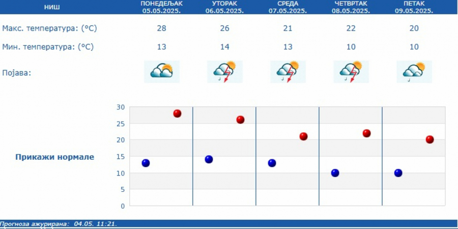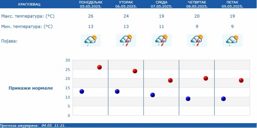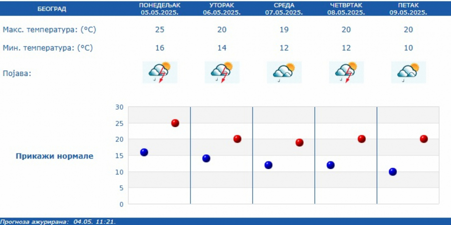 Prema izgledima vremena u Srbiji za narednih sedam dana, do 12. maja, očekuje se promenljivo oblačno, malo svežije i nestabilno, povremeno sa kišom i lokalnim pljuskovima sa grmljavinom, češćim u prvoj polovini sedmice, kada su lokalno moguće obilnije padavine, kratkotrajna pojava grada i jak vetar u zoni najjačih pljuskova.