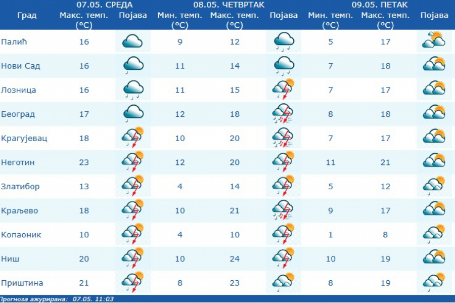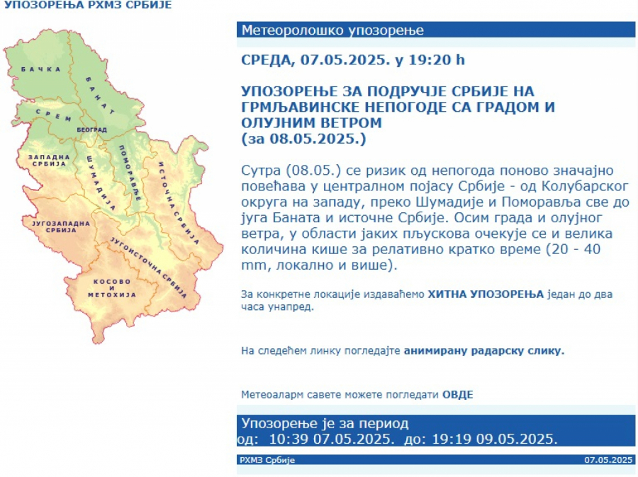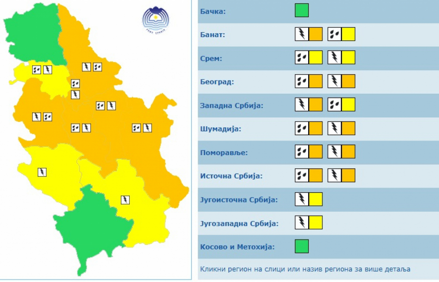 U centralnom pojasu zemlje, od Kolubarskog okruga na zapadu, preko Šumadije i Pomoravlja sve do južnog Banata i istoka Srbije ponovo će biti uslova za razvoj grmljavinskih nepogoda praćenih gradom, jakim ili olujnim vetrom u zoni pljuskova i većom količinom kiše za kratko vreme.