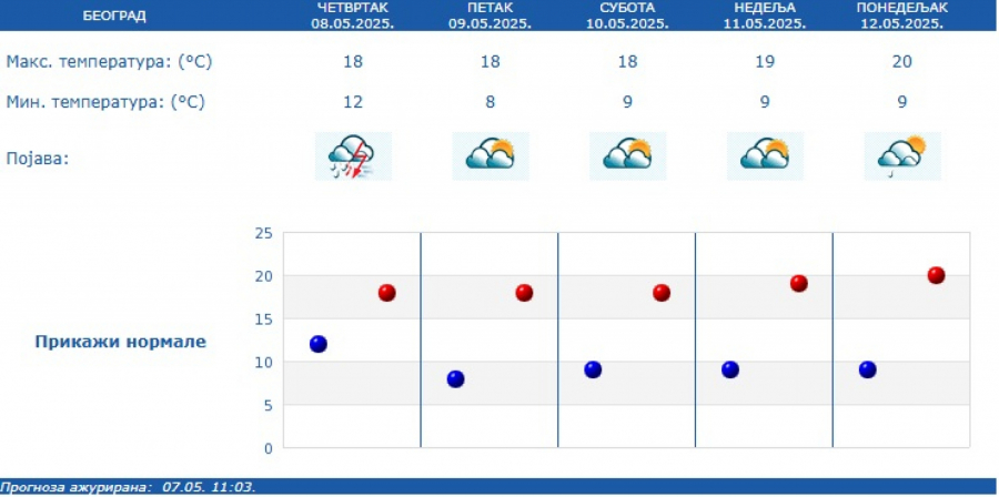 Van grmljavinskih razvoja, vetar će biti slab do umeren, pretežno južni i jugozapadni, a u planinskim predelima i na jugu Srbije pojačan. Najniža temperatura od 7 do 12 °C, a najviša od 12 °C na severu Vojvodine do 25 °C na jugoistoku Srbije.