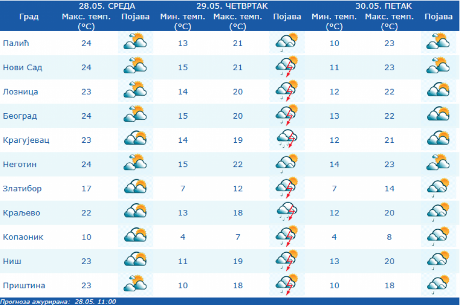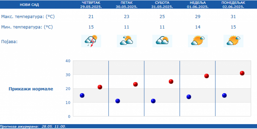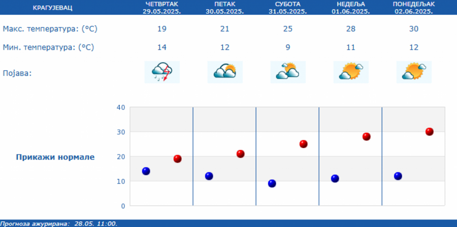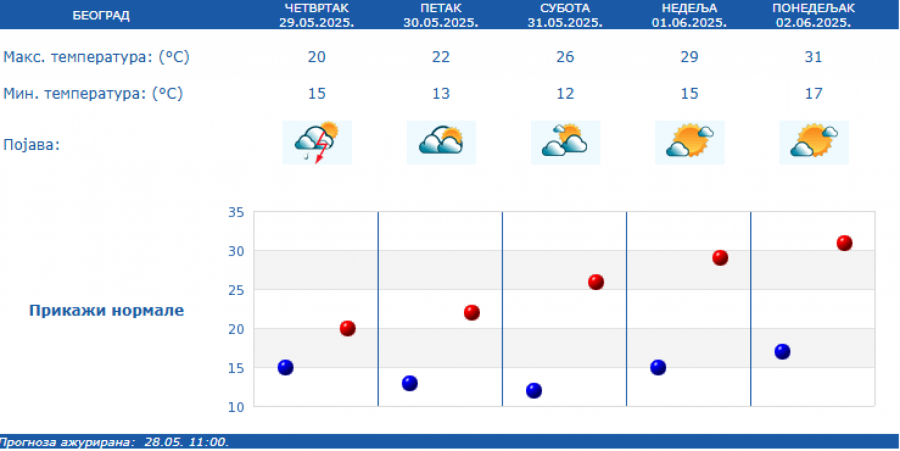 Prema izgledima vremena u Srbiji za narednih sedam dana - do 5. juna, u petak i subotu biće promenljivo oblačno uz smenu sunčanih i oblačnih intervala i tek ponegde kratkotrajnu pojavu kiše ili pljuska.