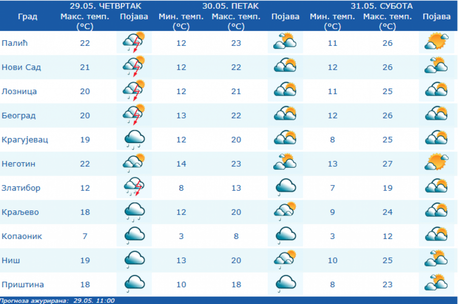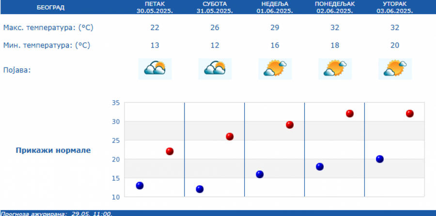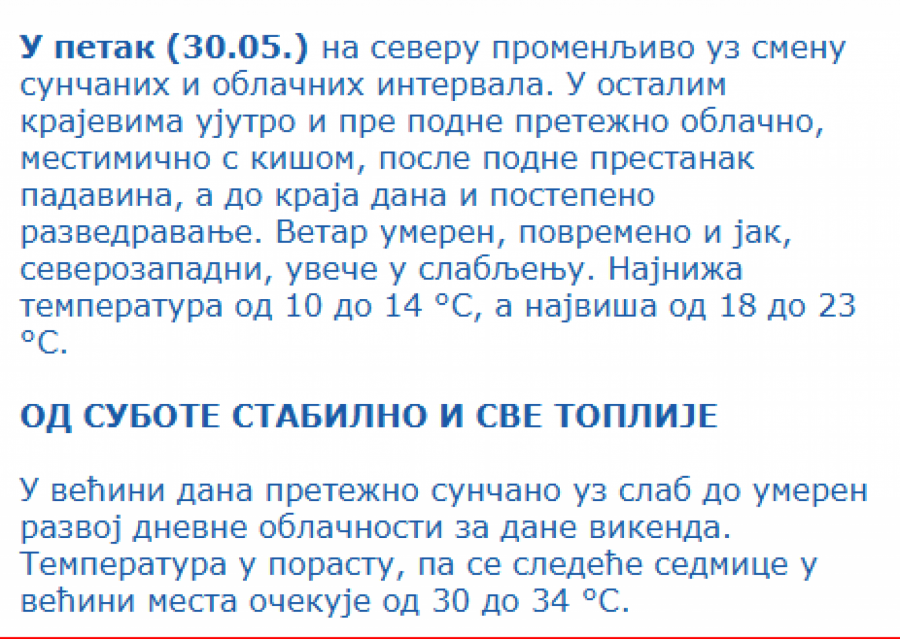 Duvaće umeren zapadni i severozapadni vetar, uveče u slabljenju. Najniža temperatura biće od 11 do 13 stepeni, a najviša oko 22 stepena.