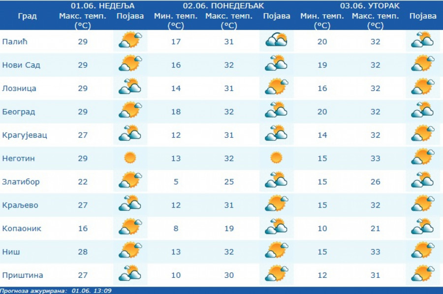 U toku dana pretežno sunčano i još toplije uz maksimalnu temperaturu do 33 stepena.