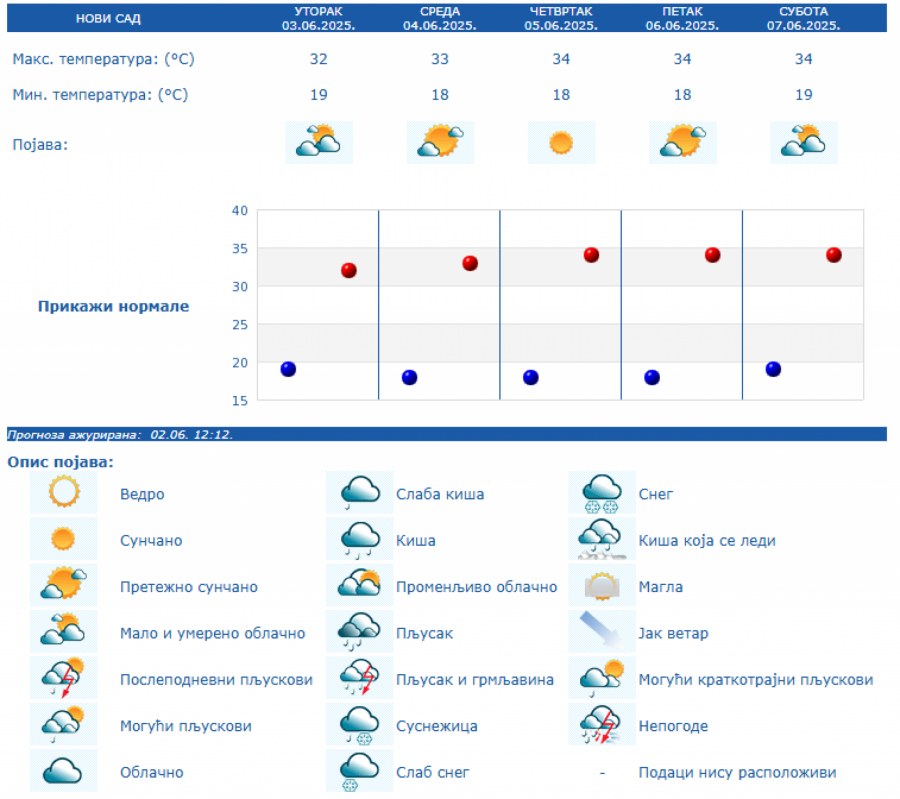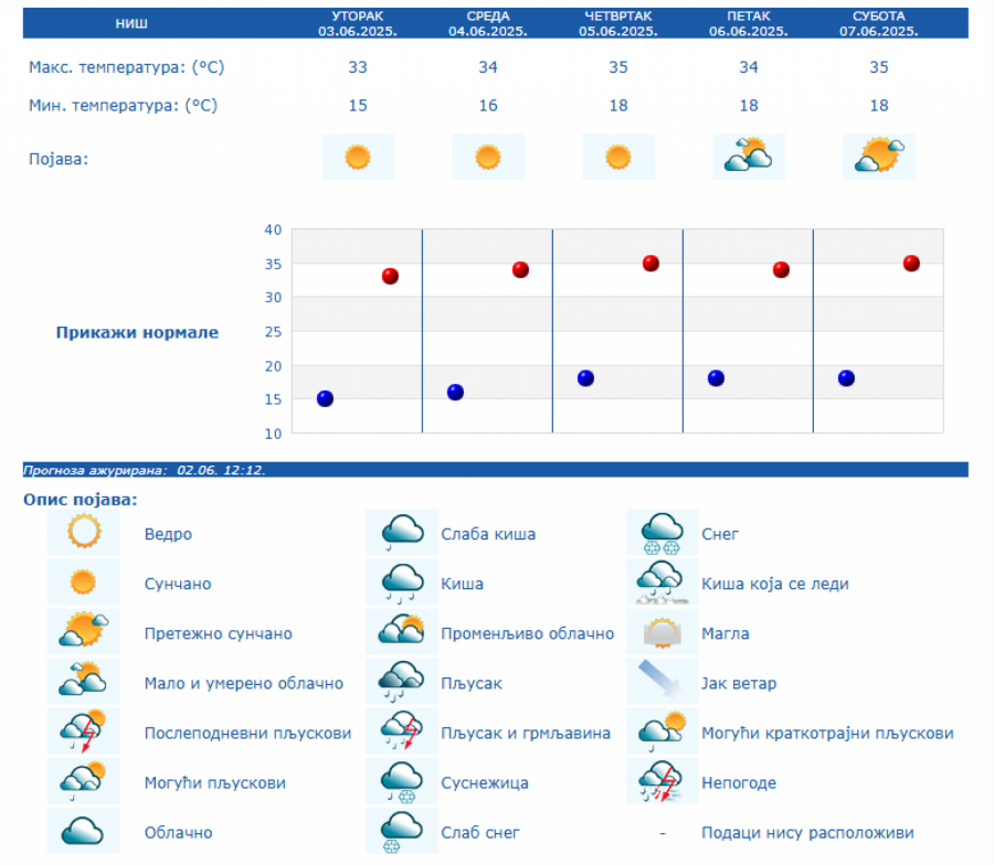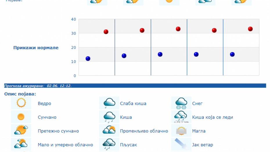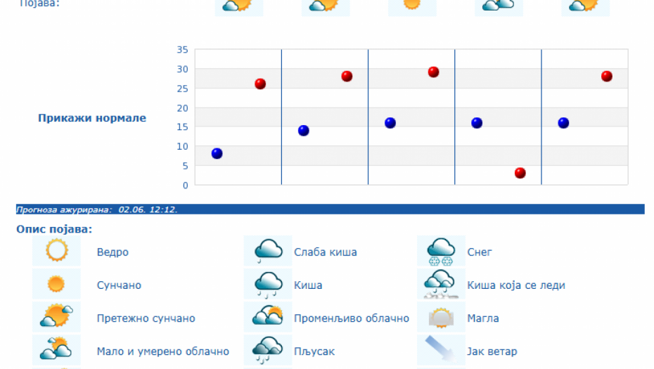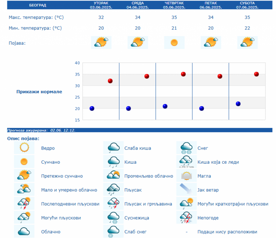 U Srbiji će u utorak, 3. juna biti pretežno sunčano i toplo vreme, duvaće slab i umeren, zapadni i jugozapadni vetar, a temperature će se kretati od 11 do 34 stepena, saopštio je Republički hidrometeorološki zavod.