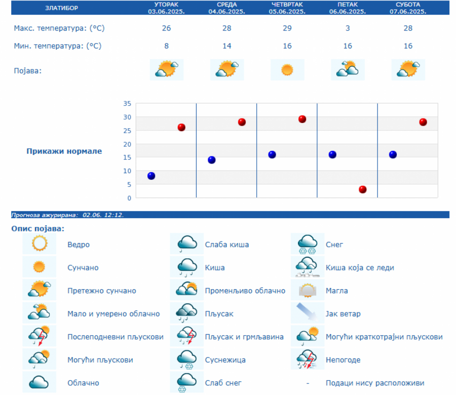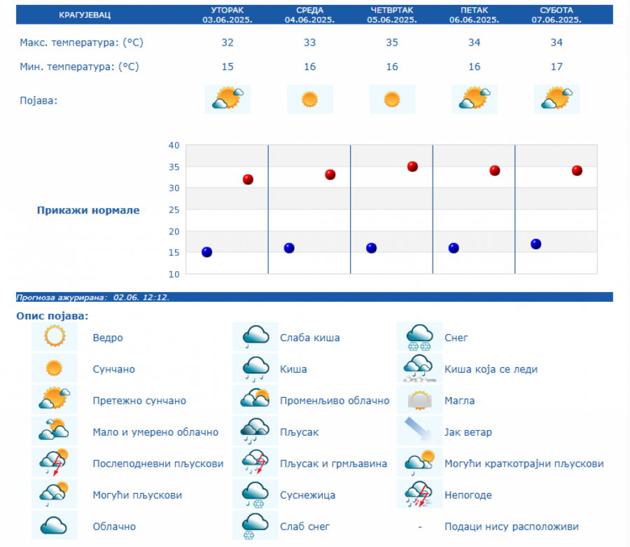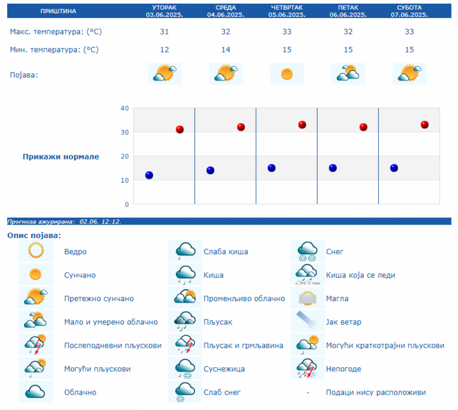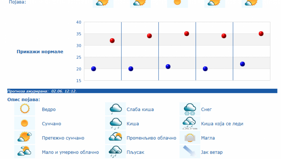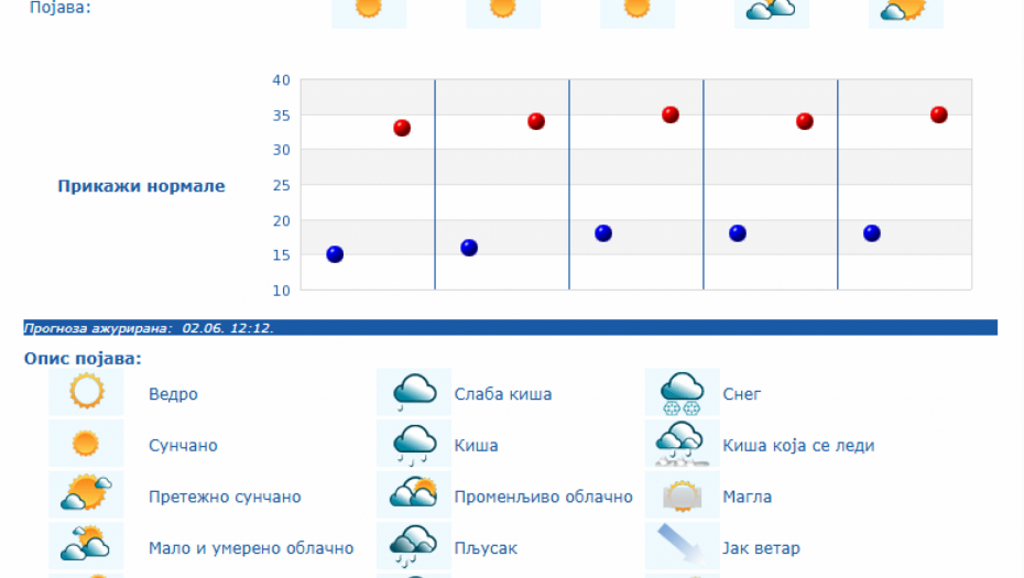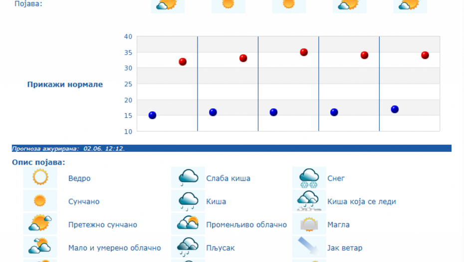 U Srbiji će u utorak, 3. juna biti pretežno sunčano i toplo vreme, duvaće slab i umeren, zapadni i jugozapadni vetar, a temperature će se kretati od 11 do 34 stepena, saopštio je Republički hidrometeorološki zavod.