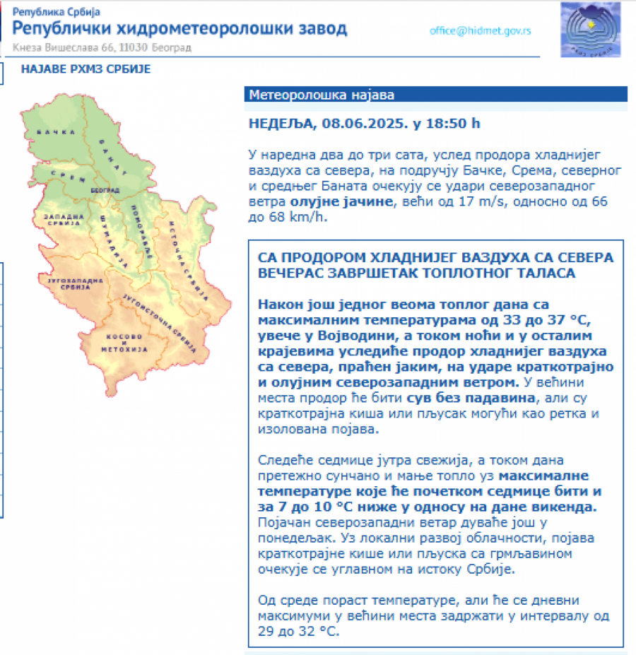 Nakon još jednog veoma toplog dana sa maksimalnim temperaturama od 33 do 37 °S, uveče u Vojvodini, a tokom noći i u ostalim krajevima uslediće prodor hladnijeg vazduha sa severa, praćen jakim, na udare kratkotrajno i olujnim severozapadnim vetrom. U većini mesta prodor će biti suv bez padavina, ali su kratkotrajna kiša ili pljusak mogući kao retka i izolovana pojava.
