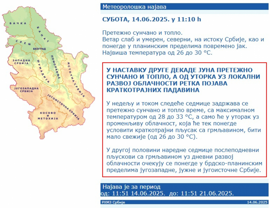 U drugoj polovini nedelje, lokalni popodnevni pljuskovi sa grmljavinom mogući su u brdsko-planinskim predelima jugozapadne, južne i jugoistočne Srbije, usled razvoja dnevne oblačnosti.