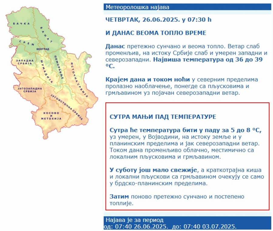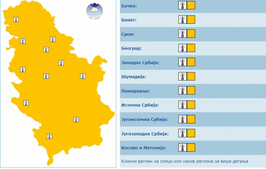 Ujutru od 16 do 24, najviša dnevna od 36 do 39 stepeni, pa će u celoj zemlji biti na snazi narandžasti meteo-alarm.
