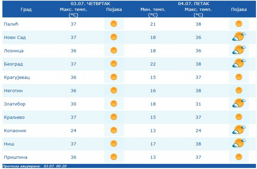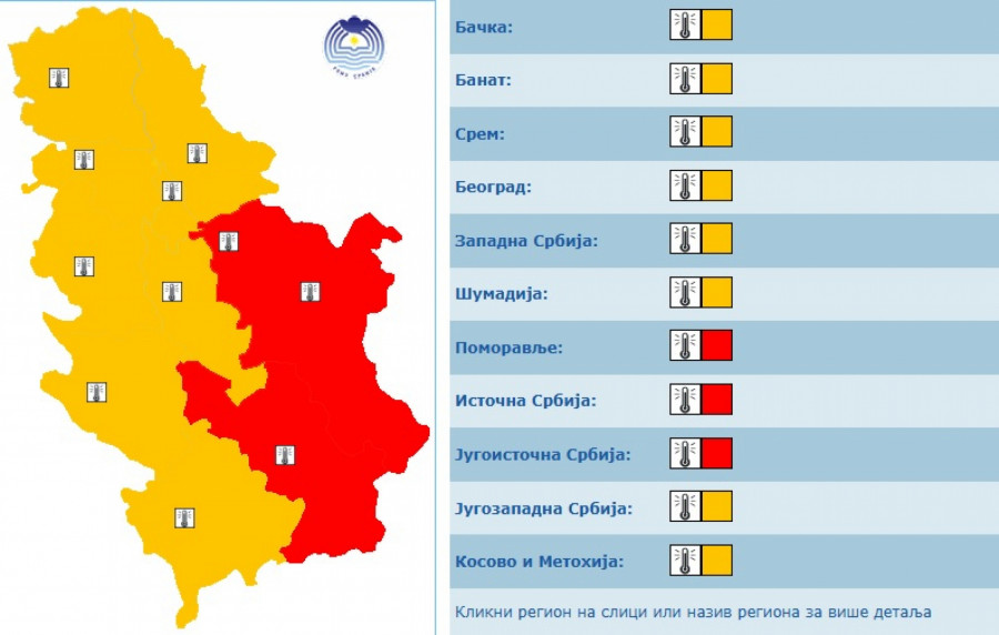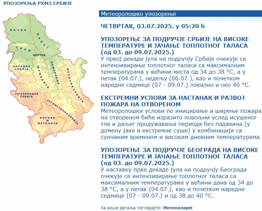 U prvoj dekadi jula na području Srbije očekuje se intenziviranje toplotnog talasa sa maksimalnim temperaturama u većini mesta od 34 do 38 °C, a u petak (04.07.), nedelju (06.07.), kao i početkom naredne sedmice (07 - 09.07.) lokalno i oko 40 °C, stoji u upozorenju RHMZ Srbije.