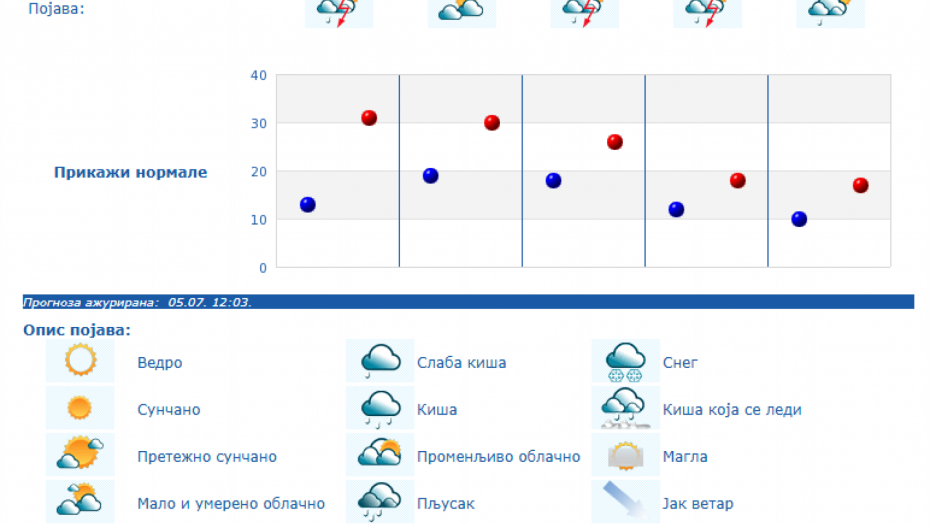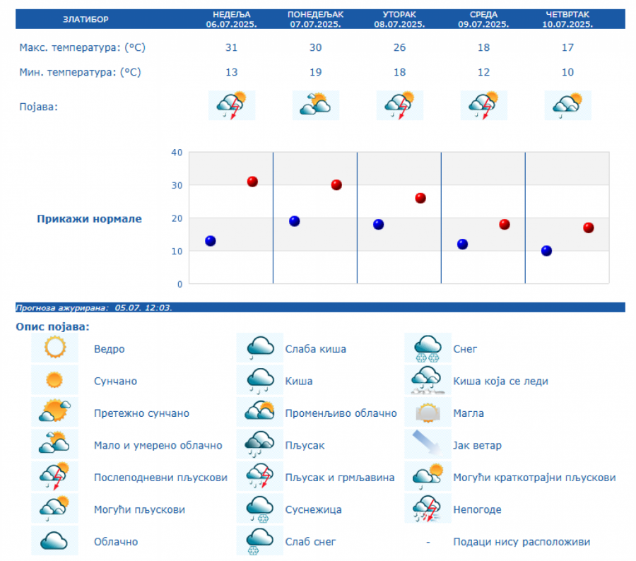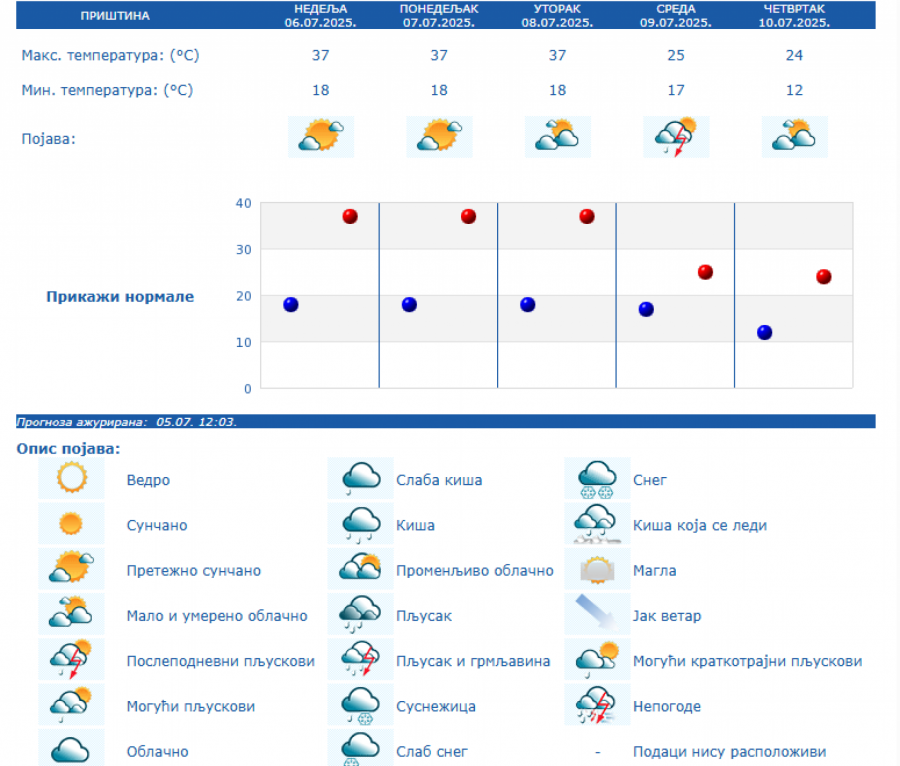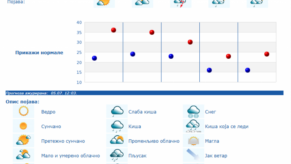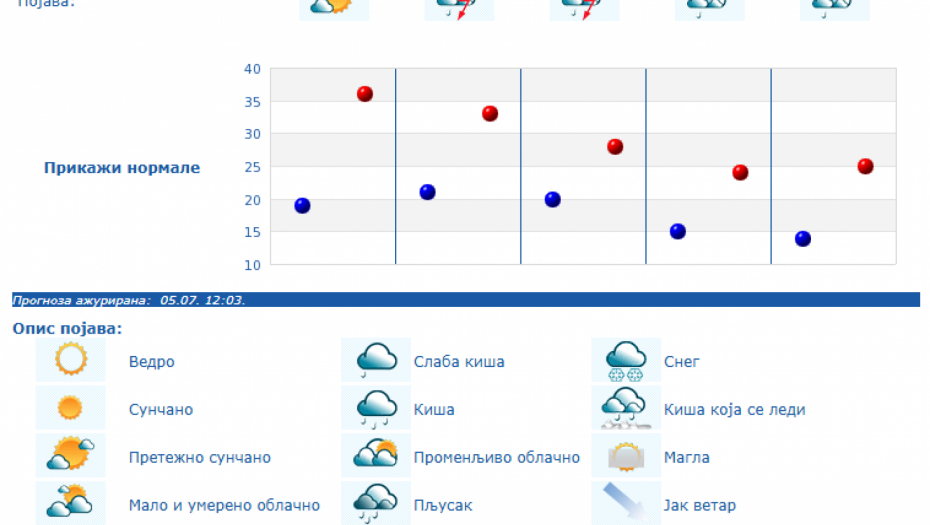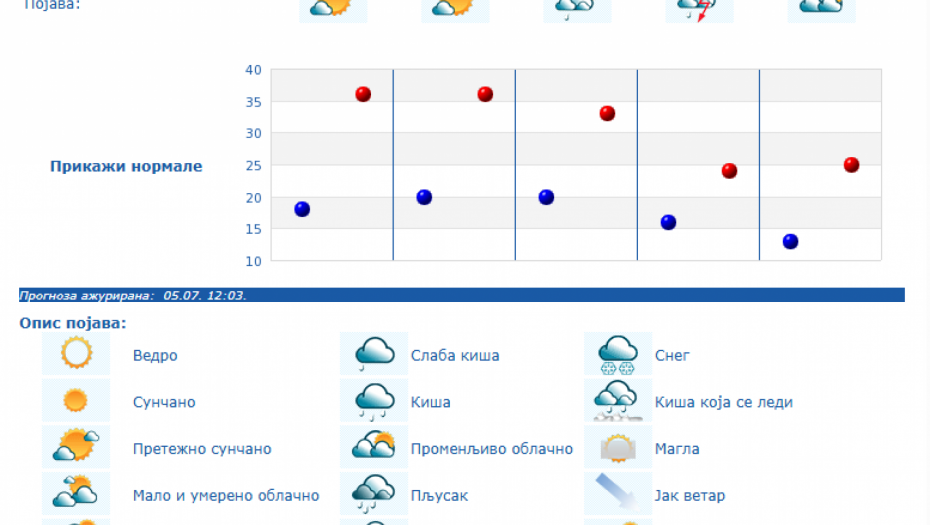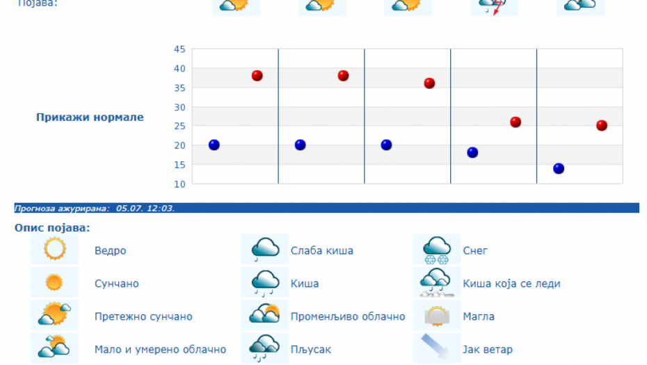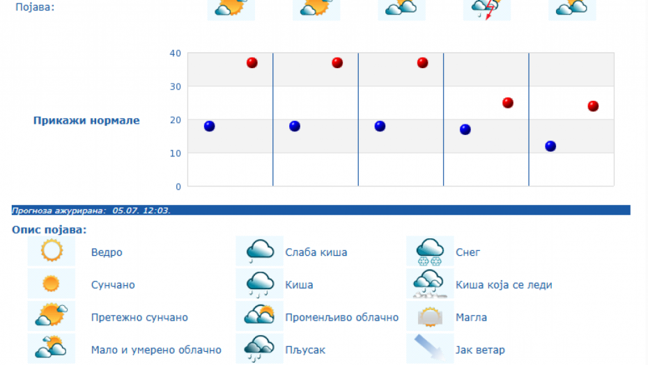 Prema prognozi Republičkog hidrometeorološkog zavoda (RHMZ), najniža sutrašnja temperatura biće od 16 do 22, a najviša od 34 do 39 stepeni Celzijusa. Duvaće slab i umeren, južni i jugoistočni vetar, posle podne u skretanju na zapadni i jugozapadni.