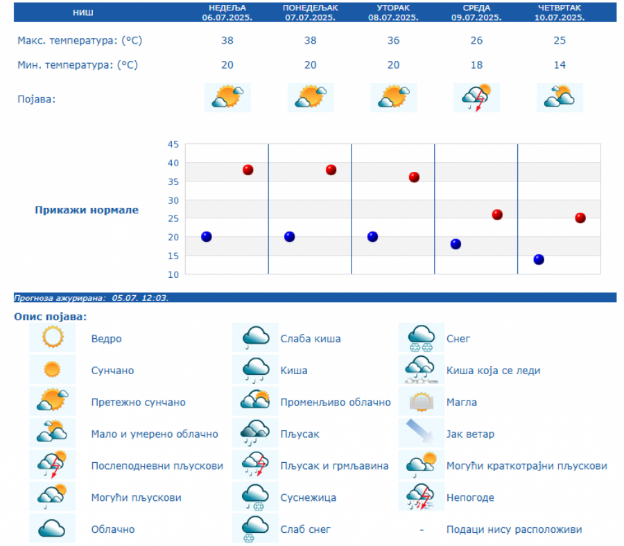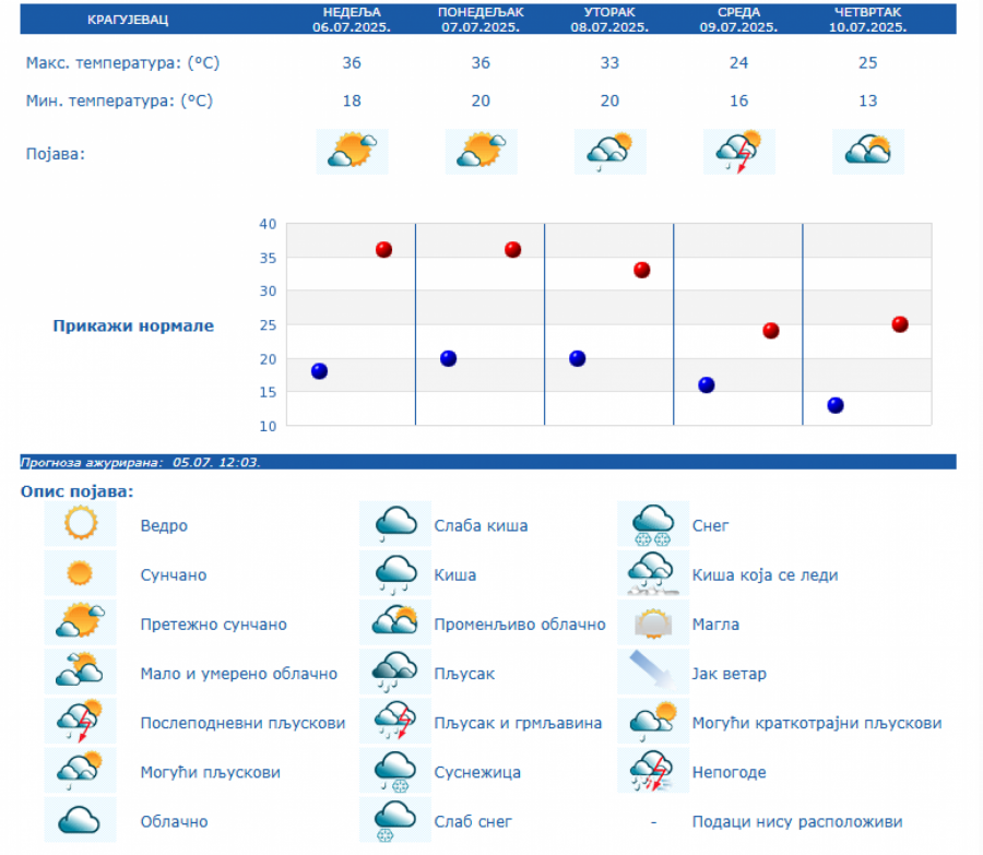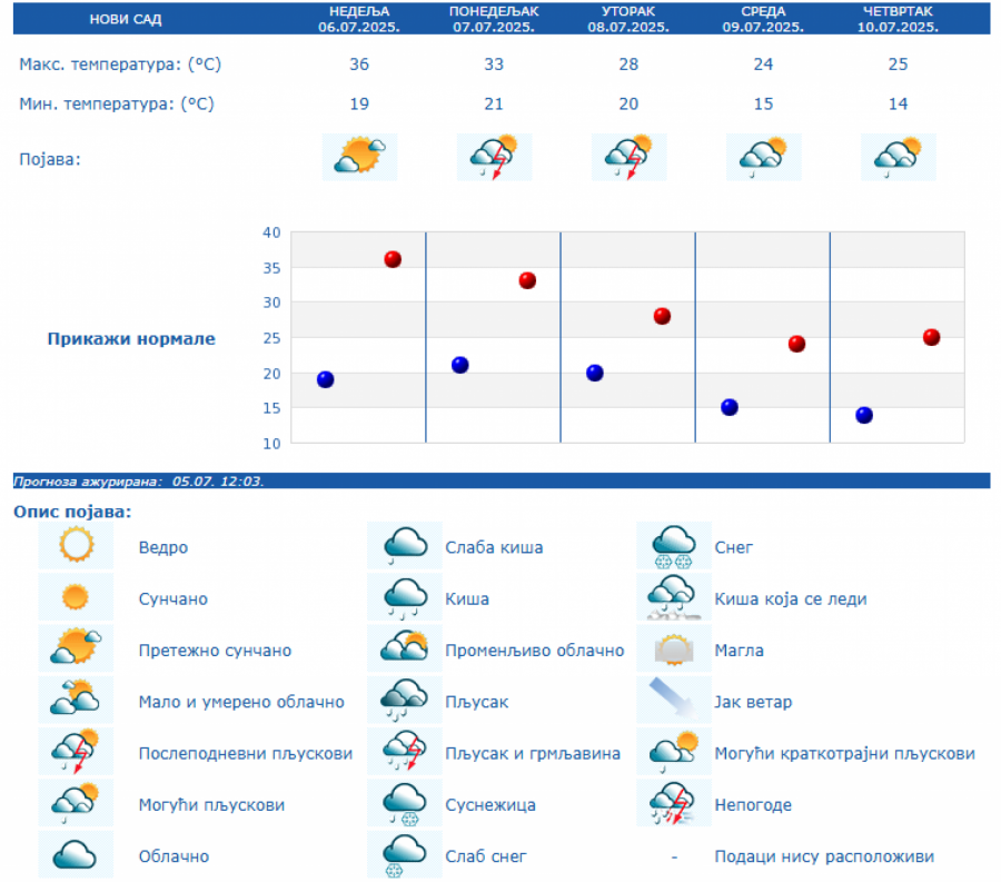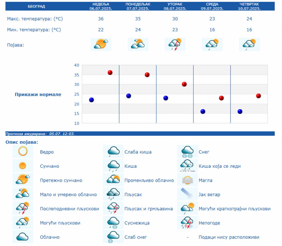Očekuje se vetar slab i umeren, istočni i jugoistočni, posle podne u skretanju na jugozapadni i zapadni. Najniža temperatura u glavnom gradu iznosiće oko 22 stepena, dok će najviša biti oko 36 stepeni. Prema izgledima vremena za narednih sedam dana, do nedelje, 13. jula, u ponedeljak (7. jula) će biti pretežno sunčano i veoma toplo sa maksimalnim temperaturama na severu i zapadu Srbije od 32 do 35, a u ostalim krajevima od 36 do 40 stepeni.