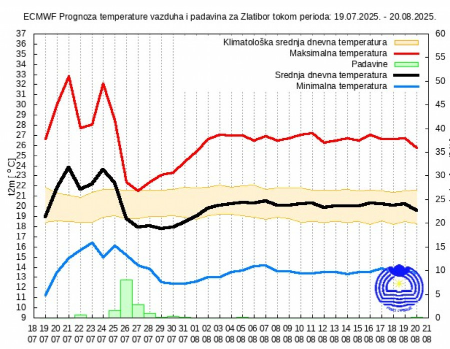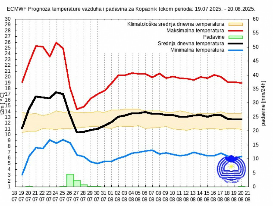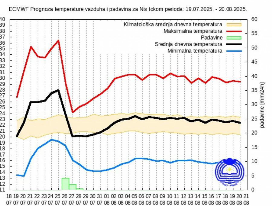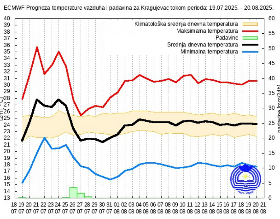 Toplotni talas se nastavlja i u narednim danima – veći deo sledeće sedmice biće pretežno sunčano, a najtoplije će biti na jugu i istoku zemlje, gde su moguće višednevne temperature od 35 do 40 stepeni, dok se u petak, 25. jula, lokalno očekuje i do 42 stepena.