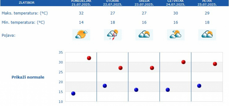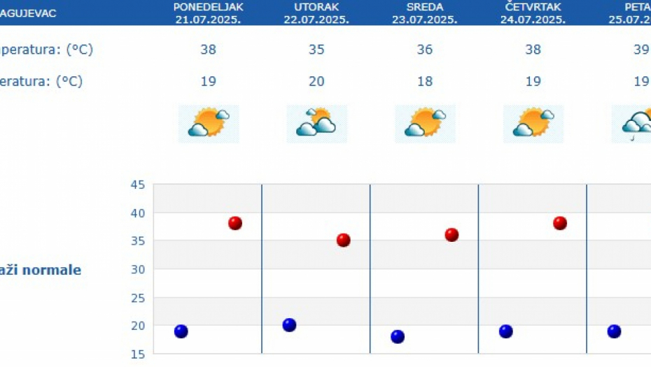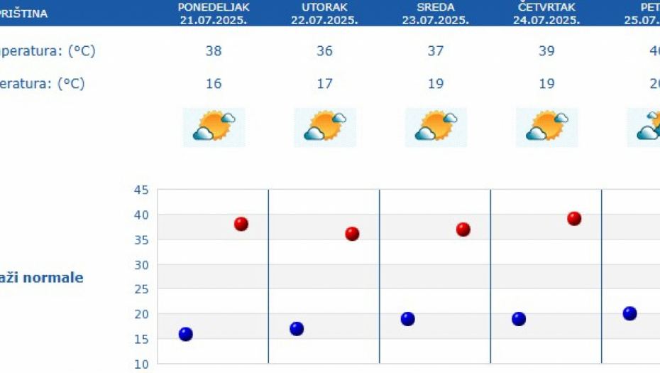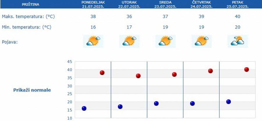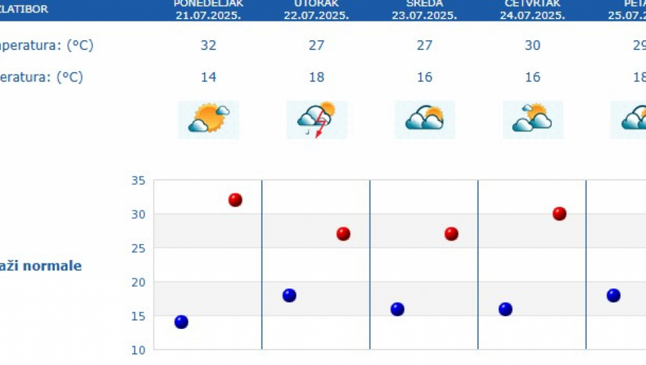 U sredu (23. jul) manji pad temperatura na severu i zapadu, ali i dalje vrlo toplo – od 31 do 35°C.