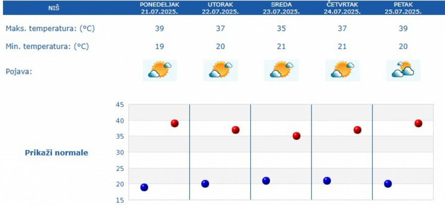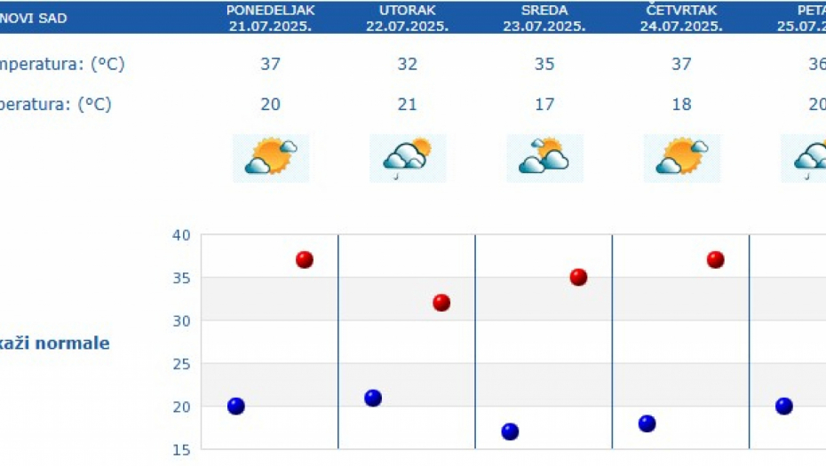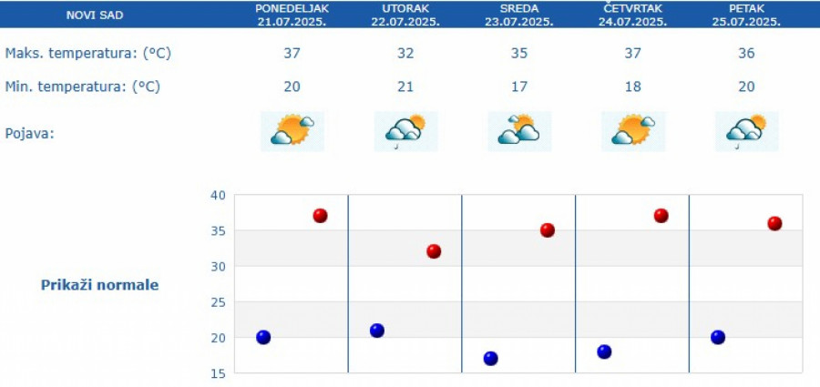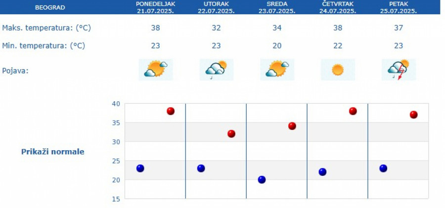 Očekivano osveženje stiže tek u nedelju, 27. jula, kada se prognoziraju pljuskovi, grmljavina i značajan pad temperature u svim krajevima.