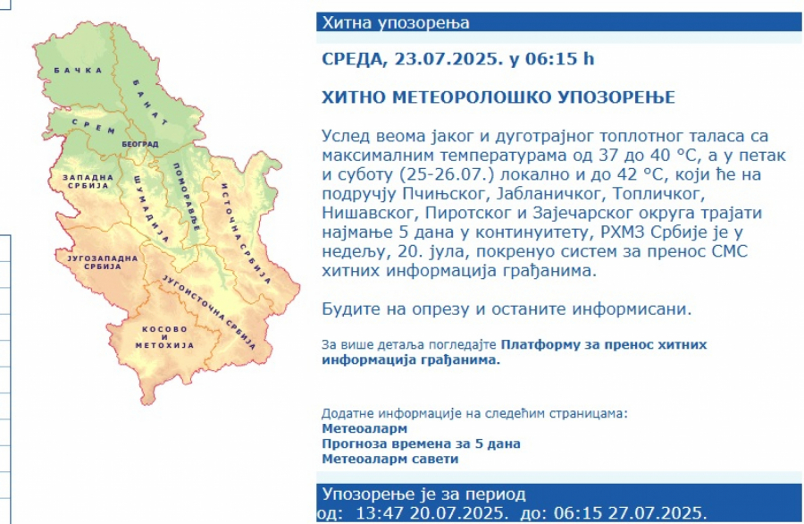 U regionima u kojima se očekuje udruženi efekat izraženog toplotnog talasa, odnosno pet dana uzastopno sa maksimalnom temperaturom od 38 stepeni i više, i dugotrajne suše, građanima su poslata i SMS upozorenja - u Topličkom, Jablaničkom, Pčinjskom, Pirotskom, Nišavskom i Zaječarskom okrugu.