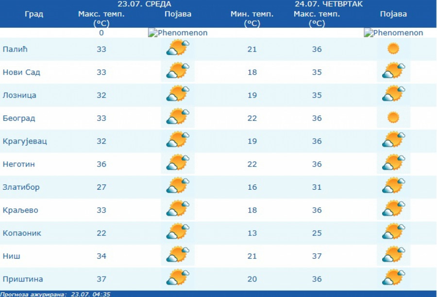 Na području Beograda danas se očekuje toplo vreme, a veoma toplo će biti od četvrtka do subote uz maksimalnu temperaturu u intervalu od 35 do 39 stepeni. U većini zemlje je trenutno žuti meteo alarm, dok je u Pomoravlju narandžasti meteo alarm.