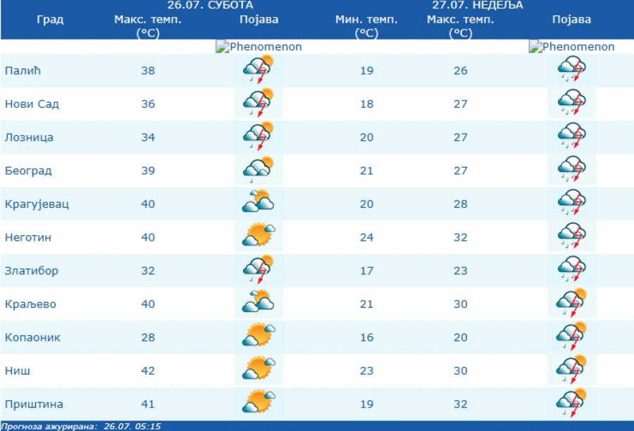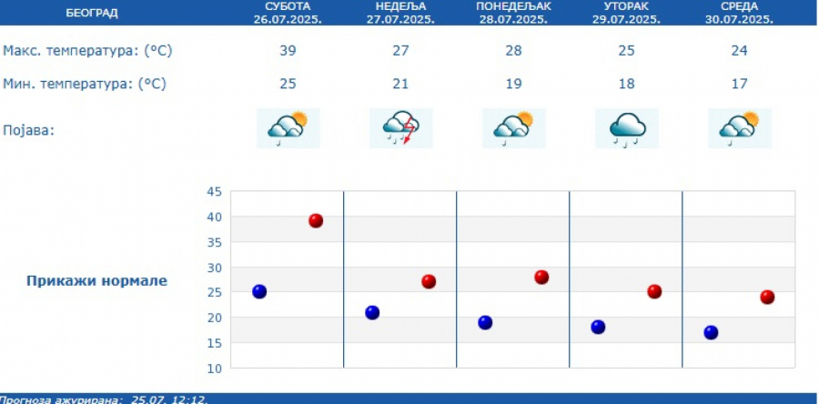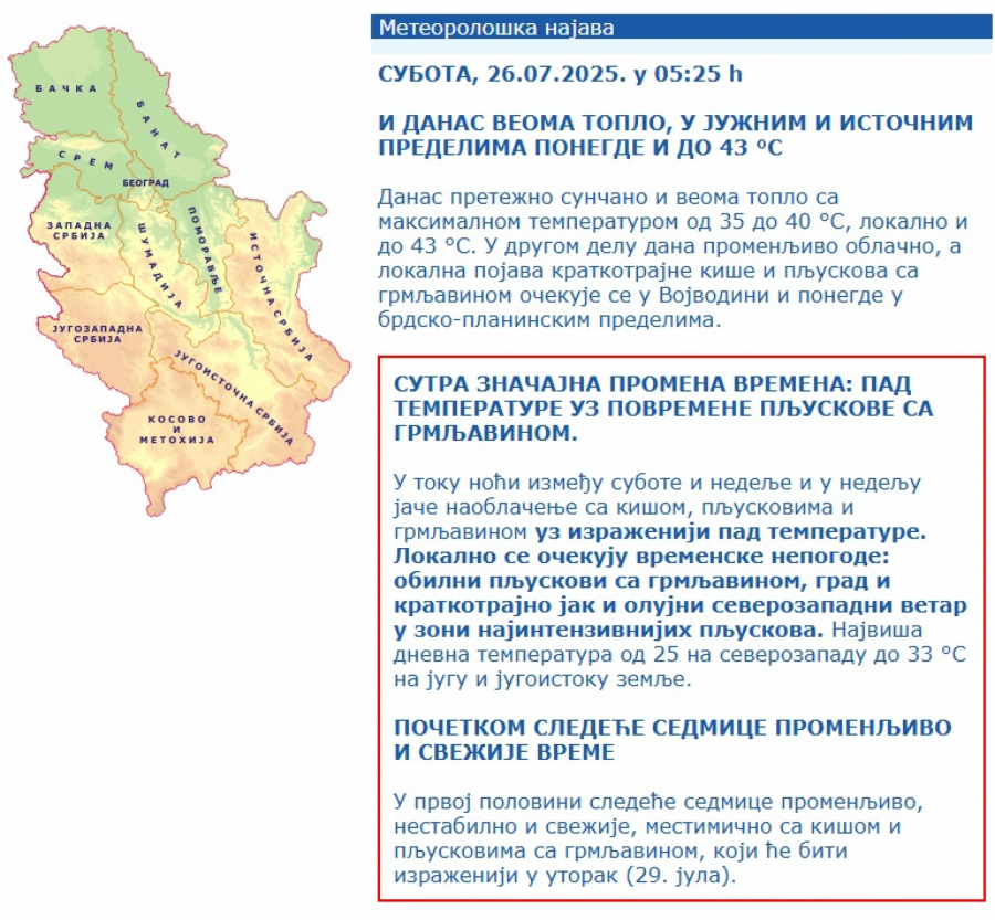 Najniža temperatura biće od 17 do 25 stepeni, a najviša od 35 do 40 stepeni, lokalno i do 43 stepena. Uveče i tokom noći uslediće jače naoblačenje s kišom, pljuskovima i grmljavinom.