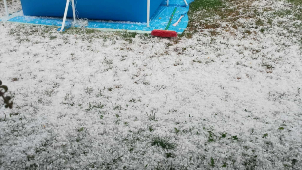 Tuče jak grad i snažan pljusak, a kako se vidi na snimku koji se deli po mrežama, celo dvorište jedne porodične kuće se zabelelo.