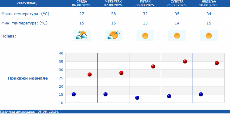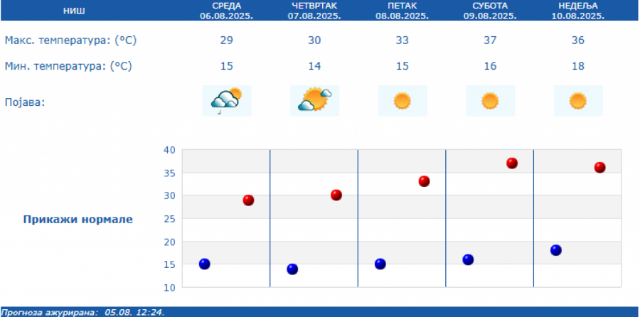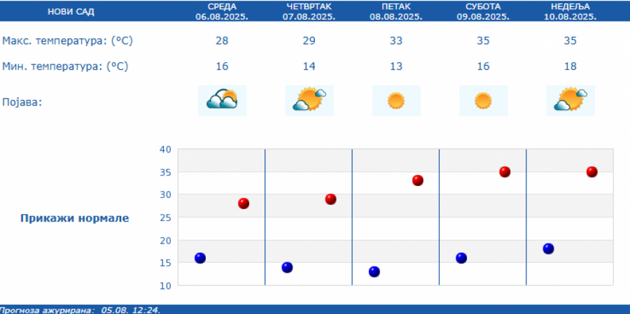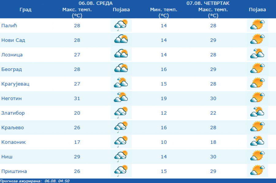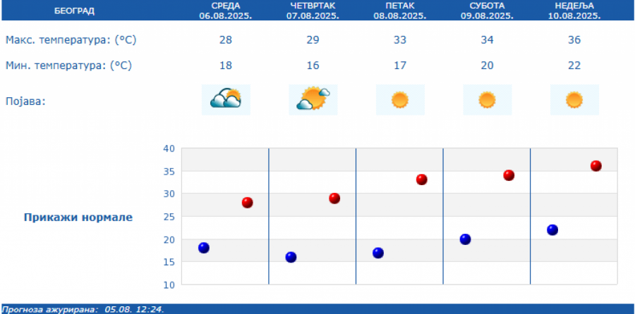 Prema prognozi Republičkog hidrometeorološkog zavoda (RHMZ), najniža temperatura biće od 13 do 20, a najviša dnevna od 27 do 31 stepen.