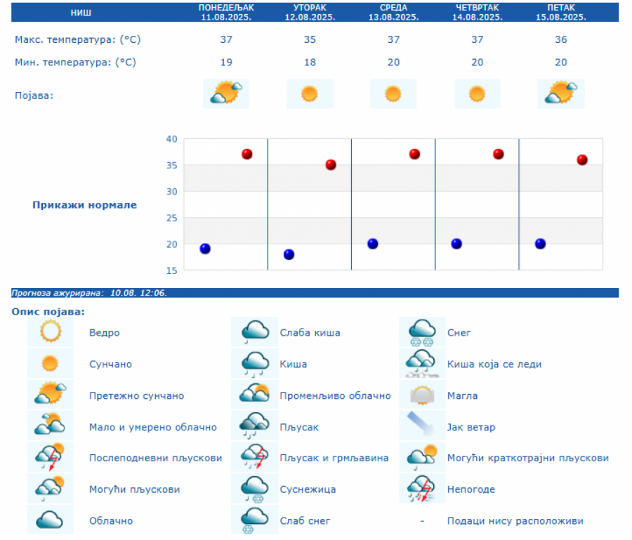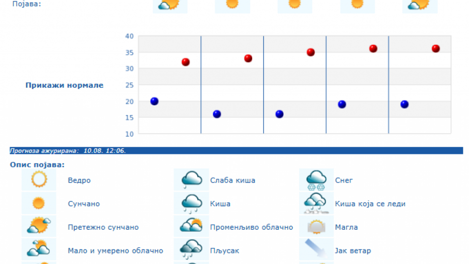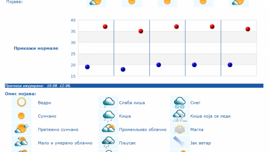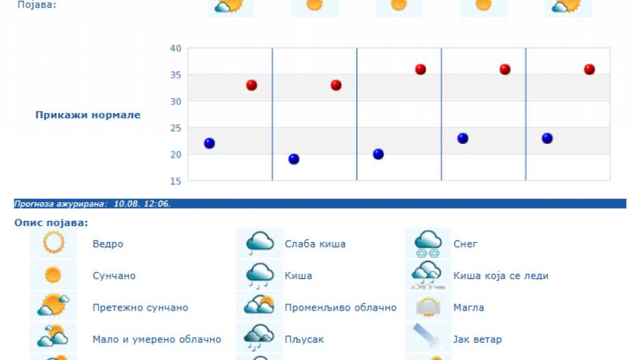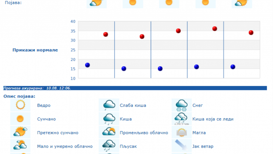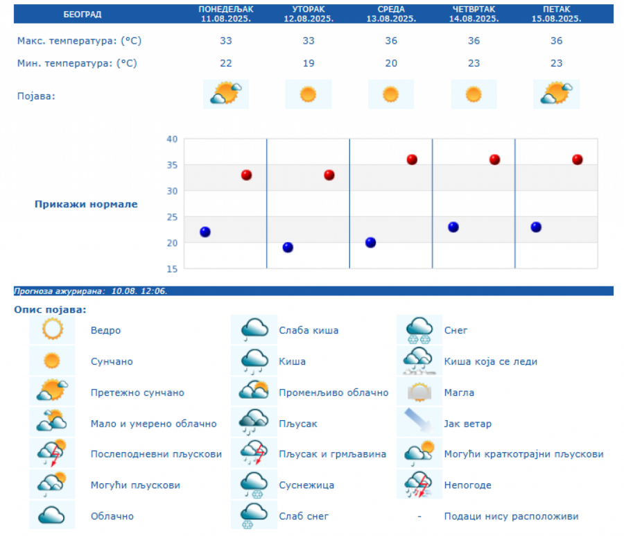 Najniža temperatura biće od 15 do 21 stepen, a najviša oko 36 stepeni. Idućih sedam dana biće pretežno sunčano i veoma toplo vreme sa maksimalnom temperaturom u većini mesta od 34 do 37 stepeni.